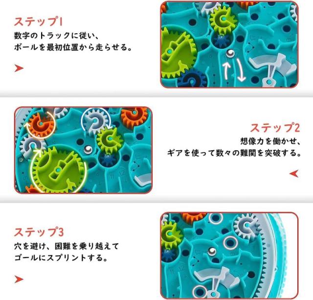 【遊び方】迷路のレール上でボールを転がしてクリアする3D立体パズルで脳トレ知育グッズ。STARTから順番に難しい障害物までバランスを崩さずに球を運びます。自らの手で本体とギアを動かし、ボールをコントロールし、それぞれの難関を突破しましょう。パネルを傾けたりしながらうまく重力を利用してボールをゴールに導きます。 他人と競争したり、タイムを競ったりしても遊べます。