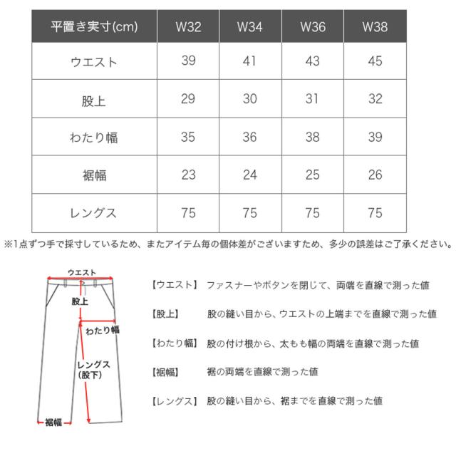 平置き実寸(cm)[ウエスト/股上/わたり幅/裾幅/レングス]:W32サイズ 39/29/35/23/75・W34サイズ 41/30/36/24/75・W36サイズ 43/31/38/25/75・W38サイズ 45/32/39/26/75 ※多少の誤差はご了承ください