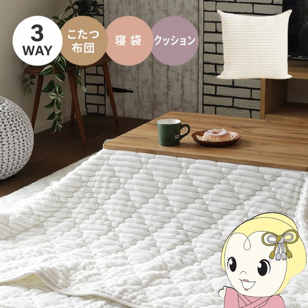 3WAY こたつ布団にもなるクッション寝袋 【サイズ】 こたつ布団:約190×190cm 寝袋:約95×190cm クッション:約50×50cm 【カラー】ミルクホワイト 【素材】 表生地:ポリエステル100% 中材:ポリエステル綿 裏面:ポリエステル100% 【機能】 ■洗濯機で洗えます(ドラム式不可) 【生産国】中国 ※モニターにより、色の見え方が実際の商品と異なることがございます。 ※画像はイメージです。商品・サイズにより柄の入り方など、現物と多少異なる場合がございます。 ※記載は商品仕様の一部です。仕様説明不足等の理由での返品はできません。特に適合等は必ずご確認ください。