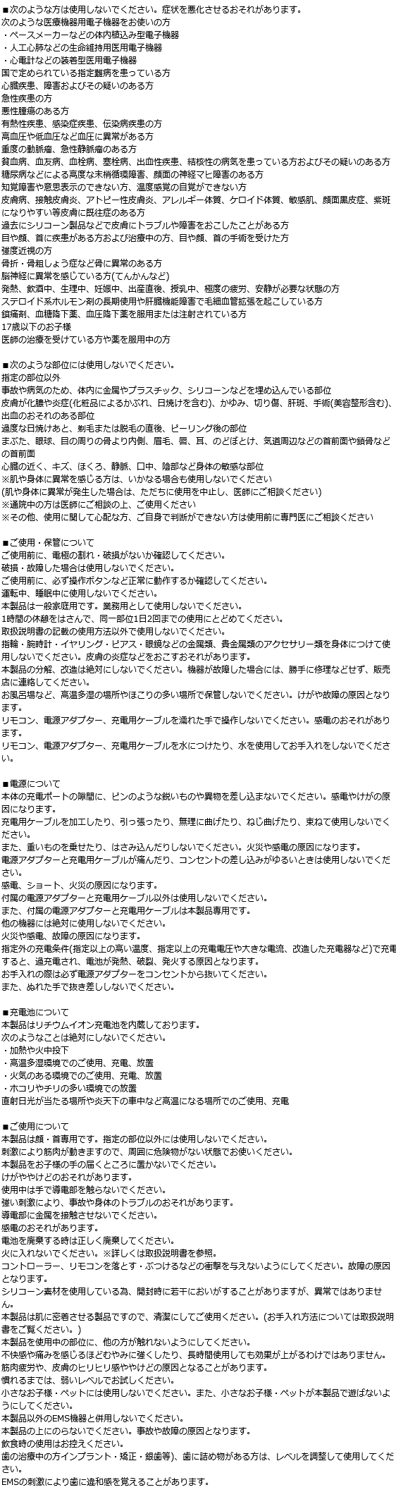 | 商品仕様 | [電源]充電式(リチウムイオン電池内蔵 30mAh/3.7V) [定格消費電力]最大0.4W [充電時間]約150分 [電池持続時間]約70分(1モード10分を7回使用)※ [タイマー]各モード10分/自動電源OFF機能 [電源アダプター]定格入力:AC100〜240V 50/60Hz 定格出力:DC5V 1A ※メーカー推奨の使用方法に準じます。 実際の時間は、使用環境や使用状況により異なります。 |
