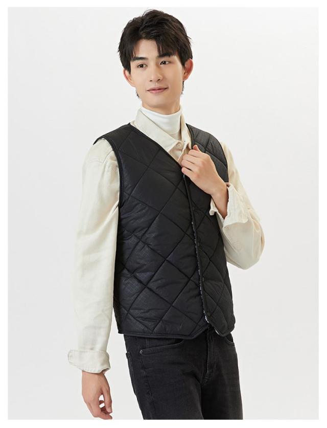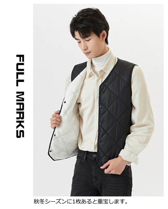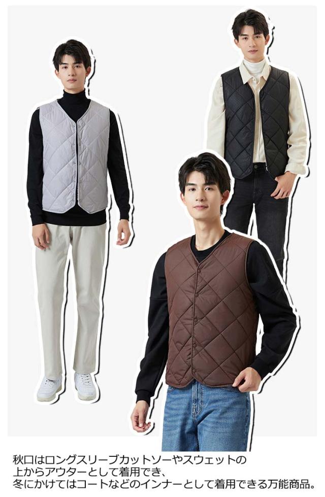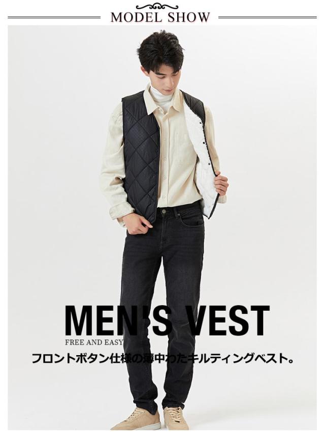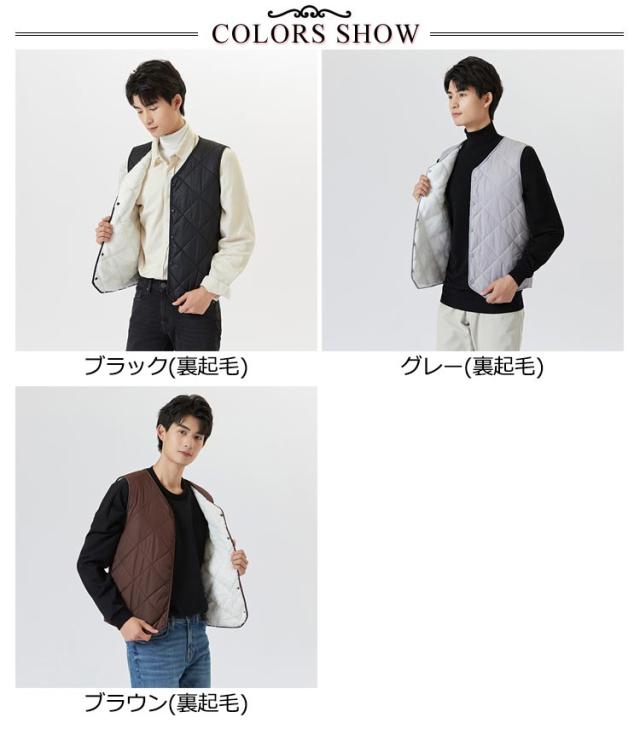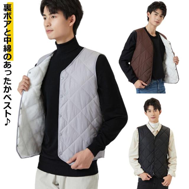 裏起毛 ベスト メンズ 前開き Vネック 中綿 キルティング フロントボタン ノースリーブ 袖なし 保温ベスト トップス インナー レイヤード 重ね着 秋 冬