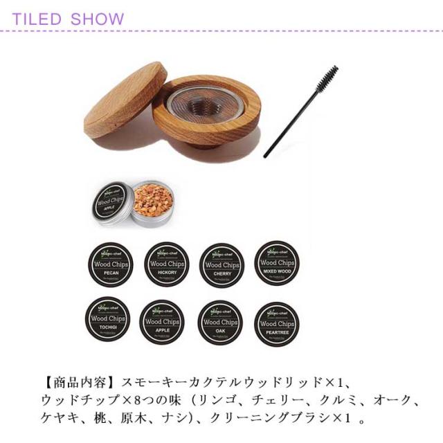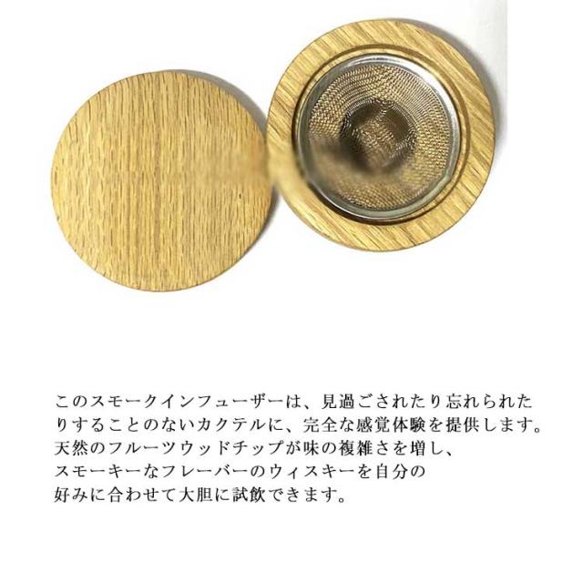 | サイズについての説明 | サイズ:スモーキーカクテルウッドリッド:直径9cm 厚さ5.3cm セット内容:スモーキーカクテルウッドリッド1個、フィルター1個、小さなブラシ1個、8種類の木製チップ。 ※サイズ計測には誤差が生じます。 |
