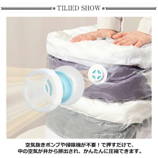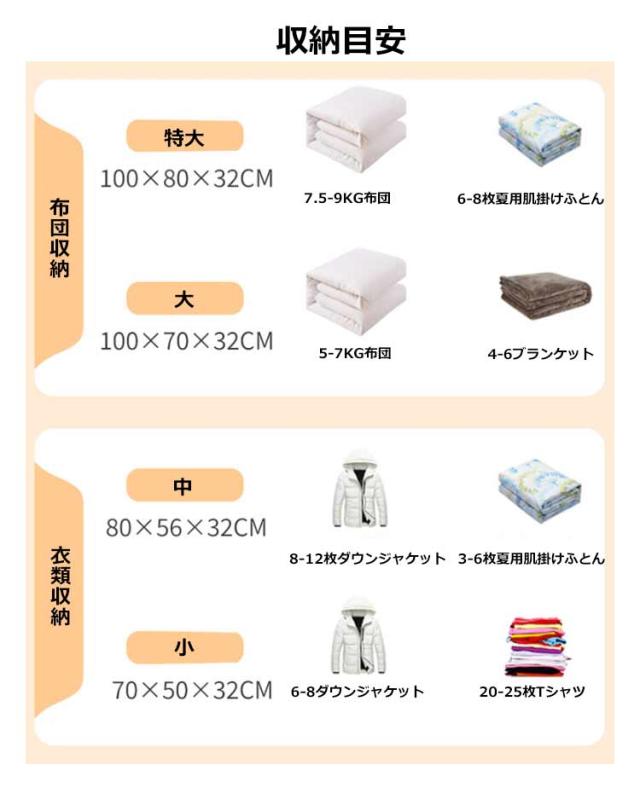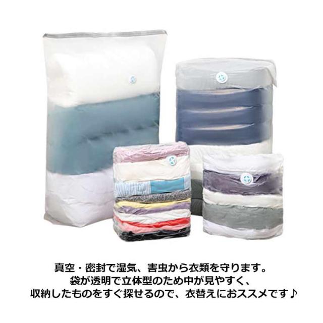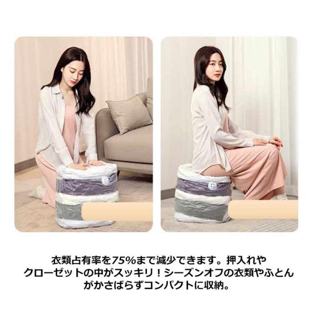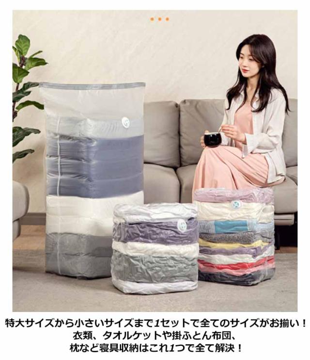 | サイズ選びが迷うならこれで!4サイズセット圧縮袋。 特大サイズから小さいサイズまで1セットで全てのサイズがお揃い!衣類、タオルケットや掛ふとん布団、枕など寝具収納はこれ1つで全て解決! 空気抜きポンプや掃除機が不要!で押すだけで、中の空気が弁から排出され、かんたんに圧縮できます。 衣類占有率を75%まで減少できます。押入れやクローゼットの中がスッキリ!シーズンオフの衣類やふとんがかさばらずコンパクトに収納。 立体式の設計、平らな圧縮袋より布団などが入れやすく、簡単に圧縮できます。 専用スライダーを取り付けて横にスライドさせるだけでジッパーがしっかりと閉じますので、無駄な力がいりません。 排気にも密閉にも最適な空気弁。排気時は弱い力でもかんたんに空気が抜けます。密閉時は弁を時計回りに回して閉めます。 真空・密封で湿気、害虫から衣類を守ります。 袋が透明で立体型のため中が見やすく、 収納したものをすぐ探せるので、衣替えにおススメです♪ | |