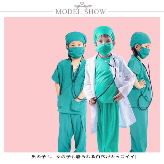 | 子供用お医者さん衣装6点セット。 6点セット(白衣+トップス+パンツ+帽子+マスク+聴診器) 男の子も、女の子も着られる白衣がカッコイイ! 聴診器付きなので、お医者さんごっこにもピッタリです。 このコスチュームを着てハロウィンや忘年会、新年会など様々なイベントを盛り上げましょう。 | |