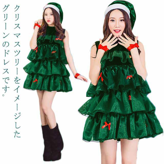 | クリスマスツリーをイメージしたグリーンのドレスです。 スカート部分はフリルを重ねて賑やかな雰囲気に。 緑のサンタ帽や腕飾り、パンツも付属した豪華なセットです | |