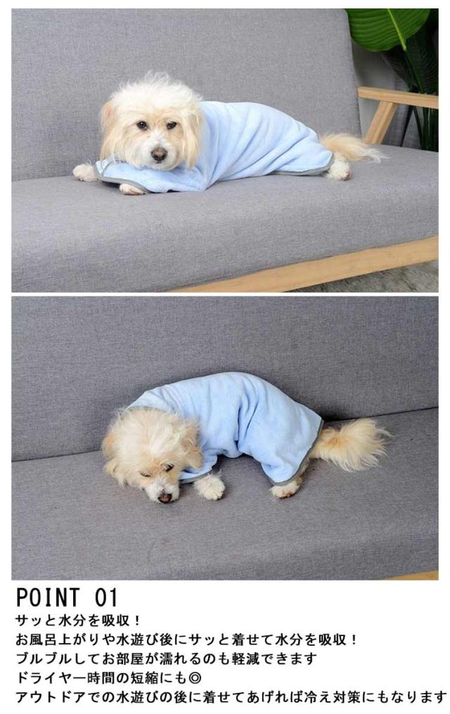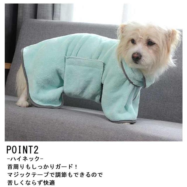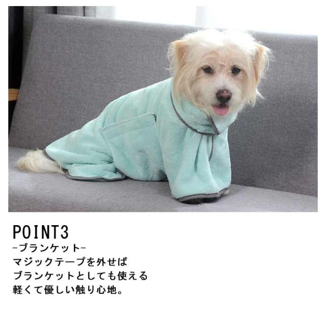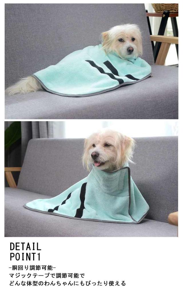 | お風呂や水遊びのあとに お家でもアウトドアでも使える便利アイテム! POINT 01 サッと水分を吸収! お風呂上がりや水遊び後にサッと着せて水分を吸収! ブルブルしてお部屋が濡れるのも軽減できます ドライヤー時間の短縮にも◎ アウトドアでの水遊びの後に着せてあげれば冷え対策にもなります POINT 02 触り心地の良い生地 柔らかいしなやかな生地で 軽くわんちゃんも快適に◎ 持ち運びも楽にできて 旅行などにもぴったり DETAIL Point1 -胴回り調節可能- マジックテープで調節可能で どんな体型のわんちゃんにもぴったり使える Point2 -ハイネック- 首周りもしっかりガード! マジックテープで調節もできるので 苦しくならず快適 Point3 -ブランケット- マジックテープを外せば ブランケットとしても使える 軽くて優しい触り心地。 | |