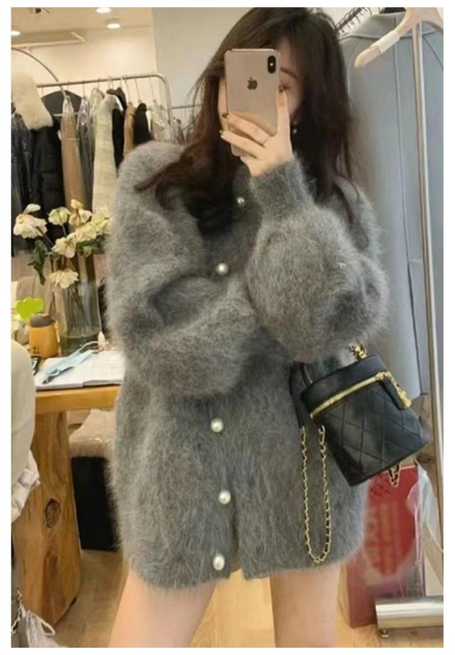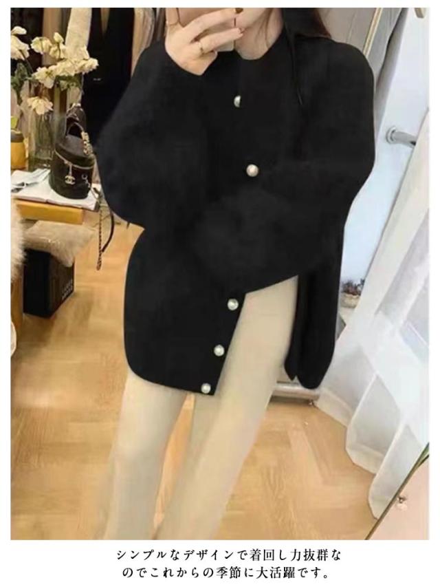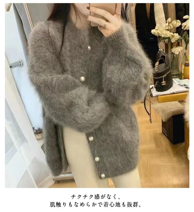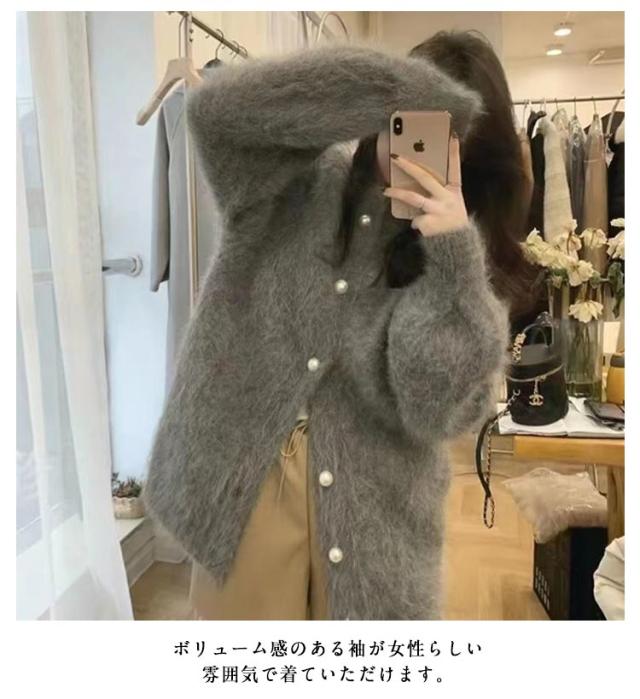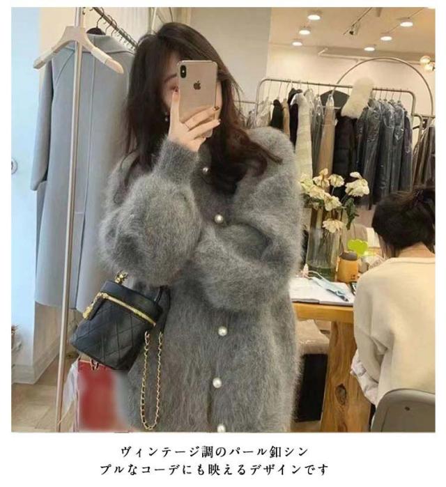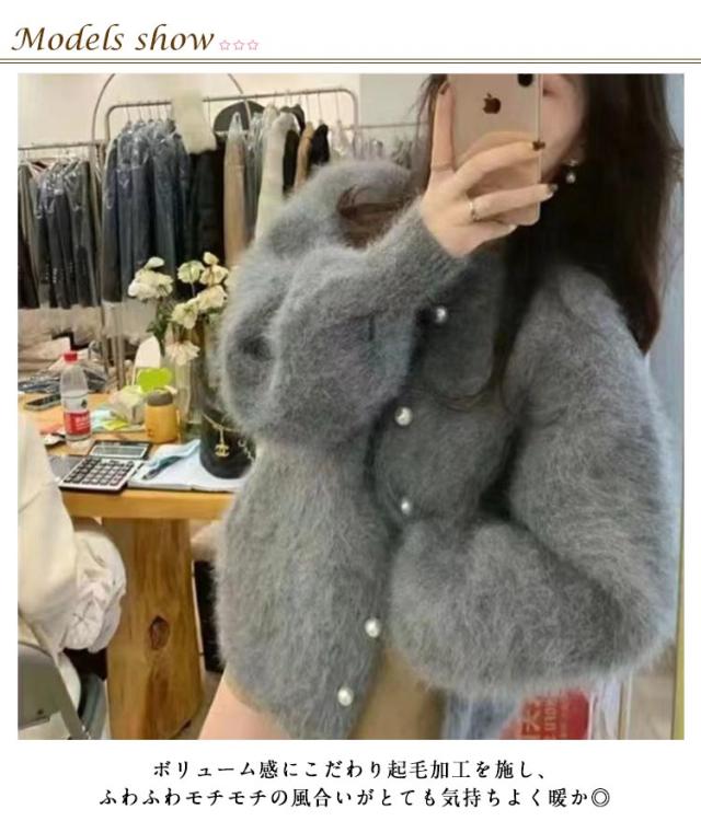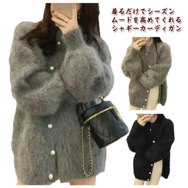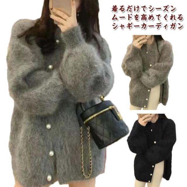 ニットカーディガン パールボタン レディース シャギーニット カーディガン ふわふわ モコモコ 羽織り クルーネック 冬 秋 アウター 厚手 あたっか 防寒 ボリュームスリーブ パフスリーブ パフ袖 きれいめ 大人 可愛い 韓国 ファッション ニットトップス 【送無】