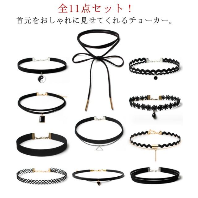 送料無料 11点セット チョーカー ネックレス レディース アクセサリー アクセ 女性 ギフト かわいい 可愛い おしゃれ 華奢 カジュアル ブラック プレゼント 大人 レディース 女性 誕生日 クリスマス 贈り物 ギフト ハロウィン コスプレ