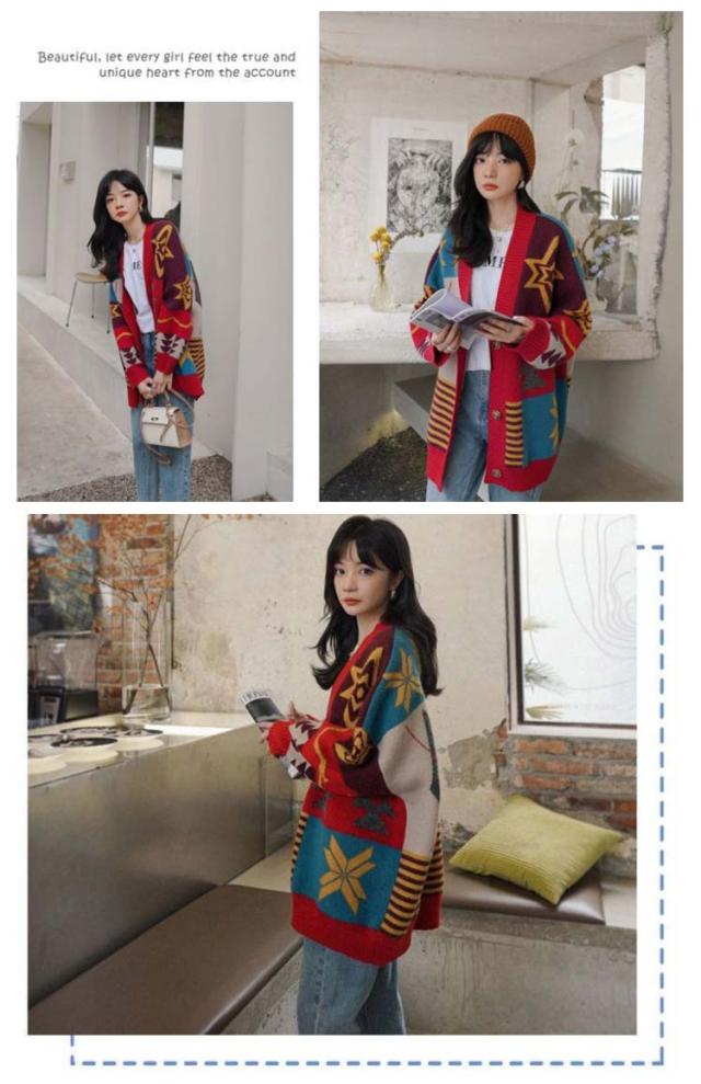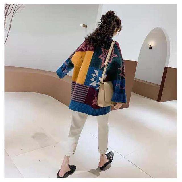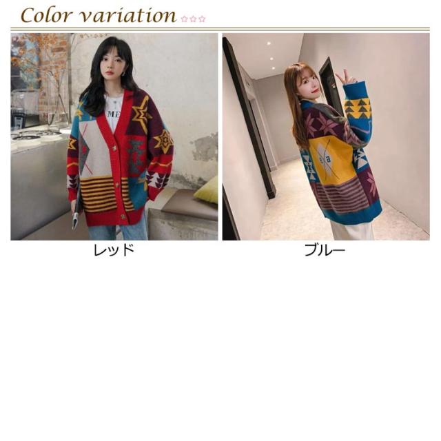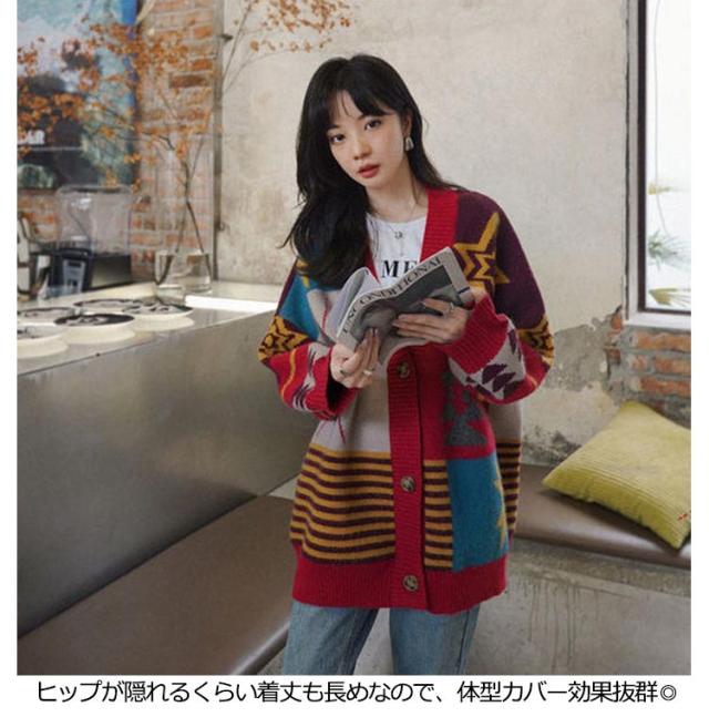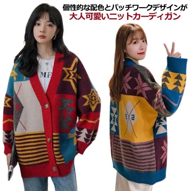 アウター パッチワーク カーディガン カーディガン ジャガード 羽織り 幾何学柄 防寒 ニットカーディガン 厚手 冬 総柄 秋 レディース ニット カーデ オーバーサイズ 秋服 秋物 あたっか Vネック 個性的 カラフル 大人 カジュアル ニット