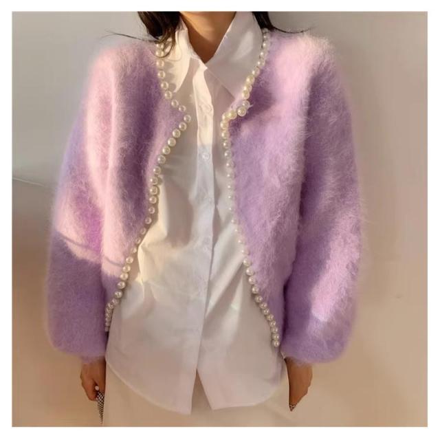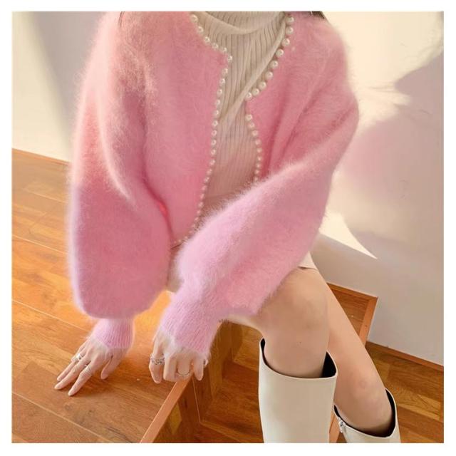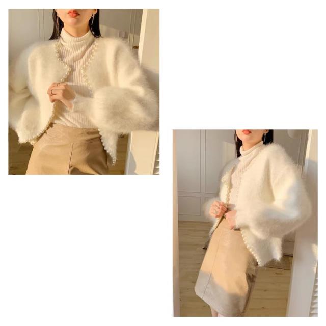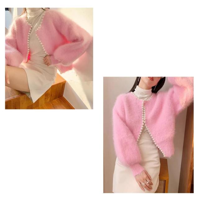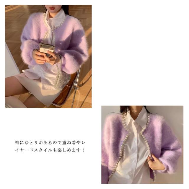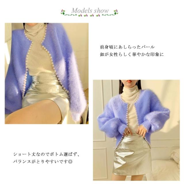 ふわふわ ニットカーディガン パールボタン レディース カーディガン バルーンスリーブ 長袖 ショート丈 ノーカラー アウター ニット トップス コート フワフワ モコモコ 暖かい 防寒 羽織り パール 無地 ゆったり カジュアル きれいめ オフィス 秋 冬 秋冬 送料無料