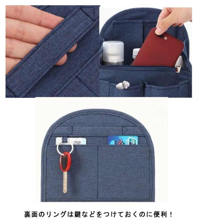 | 便利なリュック用バッグインバッグ。 お財布や手帳や化粧品ポーチやペンやスマホなど収納してリュック内部をスッキリ整頓ができます。 裏面のリングは鍵などをつけておくのに便利! 旅行で宿泊先の洗面所やクローゼットに吊るしておくと便利です。 | |