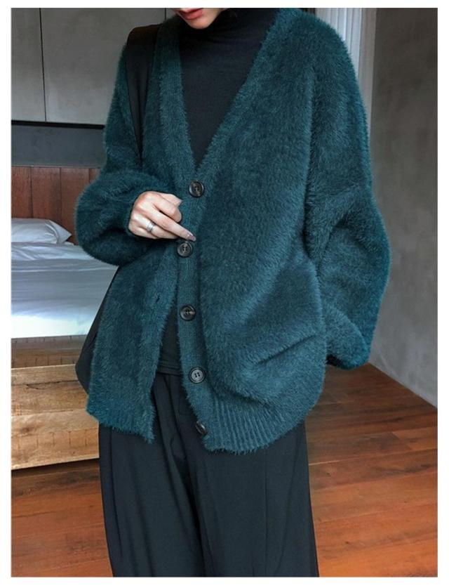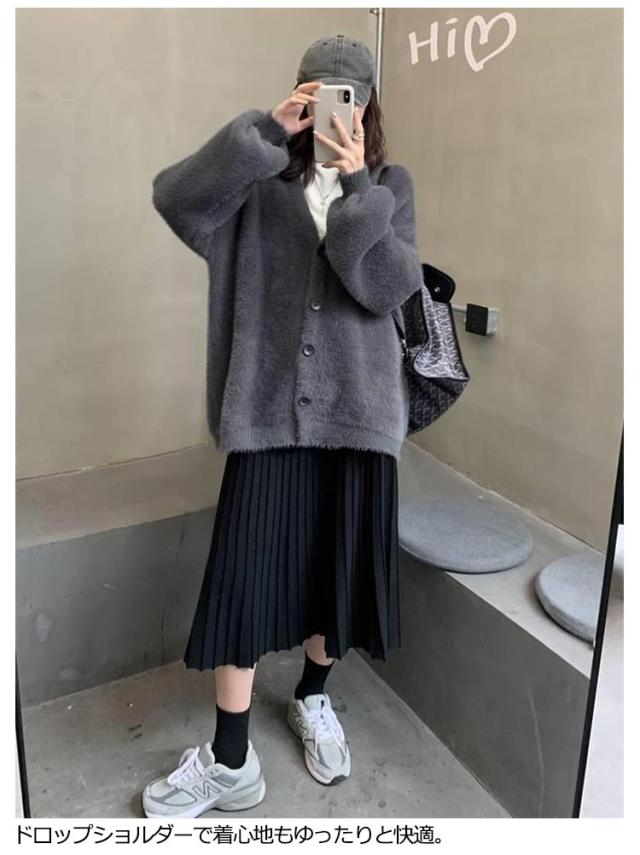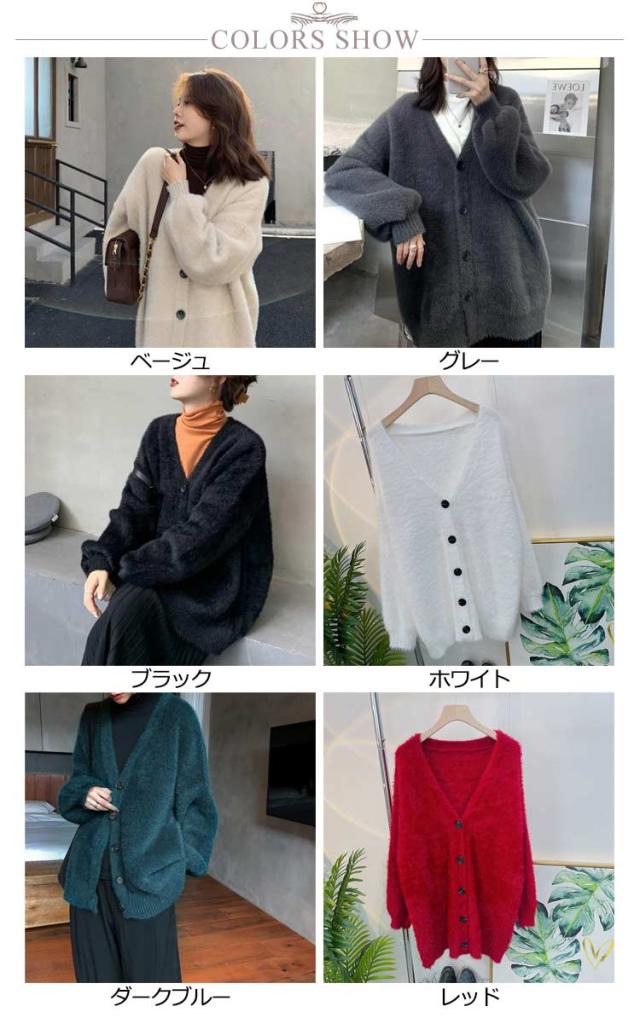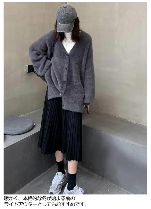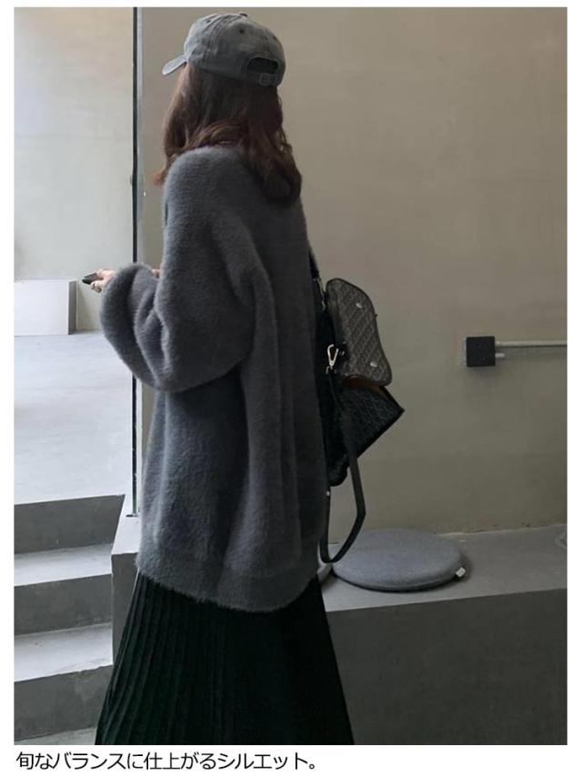 フェイクファー モコフワ カーディガン レディース ルーズシルエット 春 秋 冬 コーデ ふわふわ フワフワ ニット 長袖 おしゃれ 厚手 ファッション 着こなし カジュアル ブラック グレー ブルー オトナ 大人 かわいい トップス 送料無料