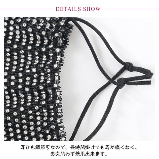 | 【2枚組】【キラキラ マスクカバー】 ラインストーン素材のキラキラマスクです。 オシャレな華やかさを際立てます。パーティーやイベントにも活躍します。 いつものマスクの上に付けるだけで気分の上がる、おしゃれなマスクカバー。 お顔周りが華やかになり、普段着にはもちろん、演奏会やウェディング等のハレの日にもおすすめのアイテムです。 キラキラ可愛くて、ファッションを演出できます。 耳ひも調節可なので、長時間掛けても耳が痛くなく、男女問わず兼用出来ます。 | |