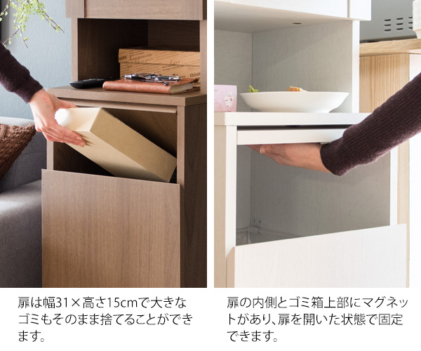 容量45Lでキッチンやリビング、寝室など収納が必要でゴミが出る場所にピッタリ。ニオイが漏れにくく押すだけで簡単に捨てられるプッシュ扉式。ゴミ袋の着脱も簡単な前扉があり、利便性もバツグンです。