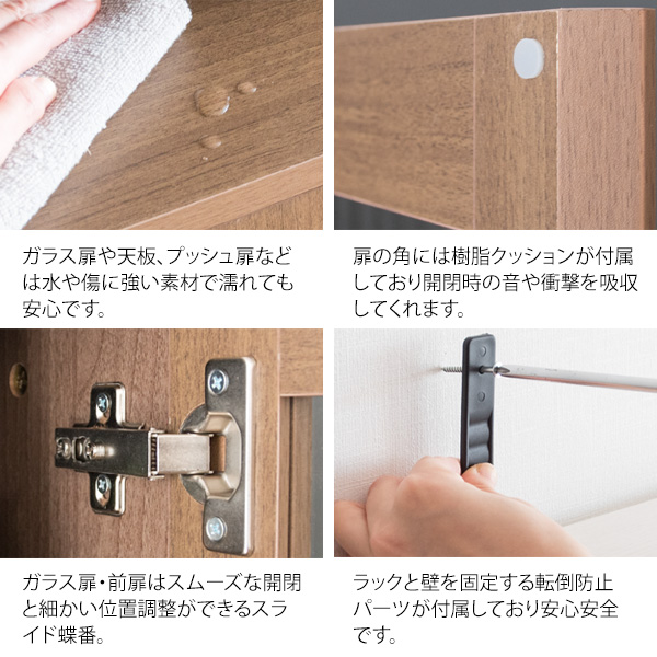 | 材質 | 合成樹脂化粧繊維板、プリント紙化粧繊維板、ガラス、スチール |