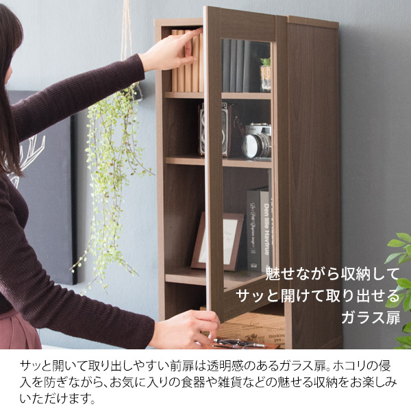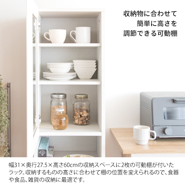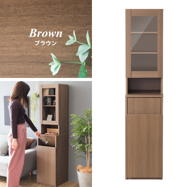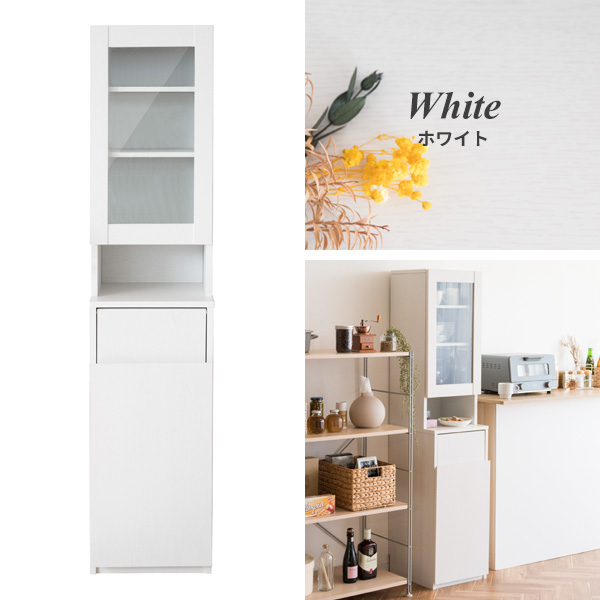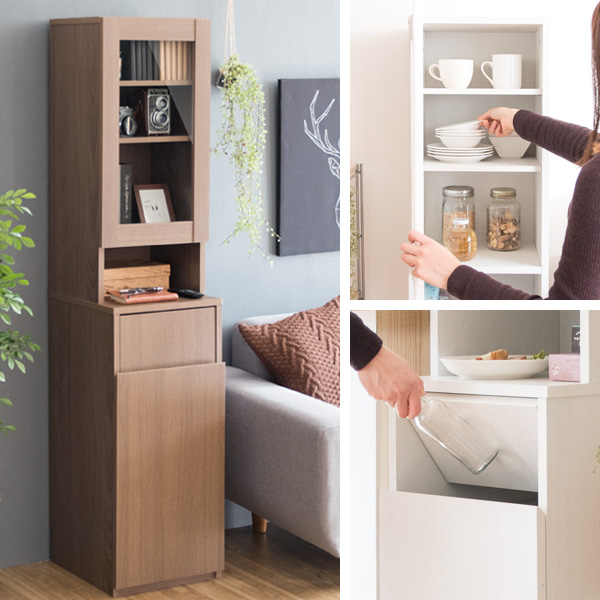 食器や雑貨が収納できるガラス扉のラックと、プッシュ式のゴミ箱が一つになったダストボックスラック。