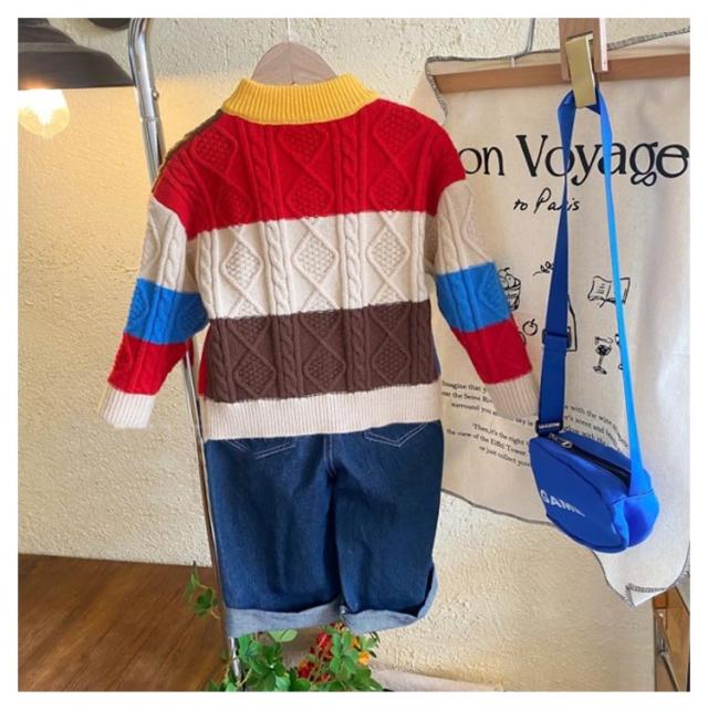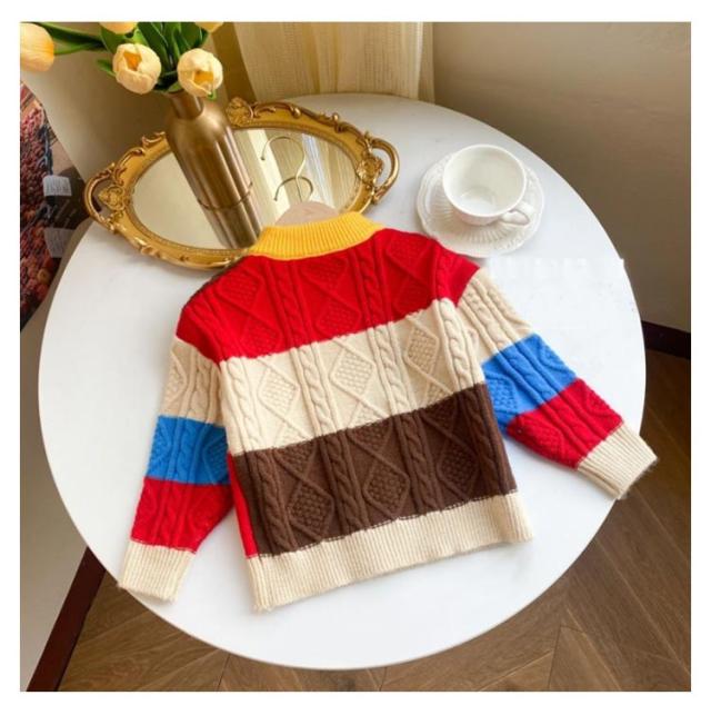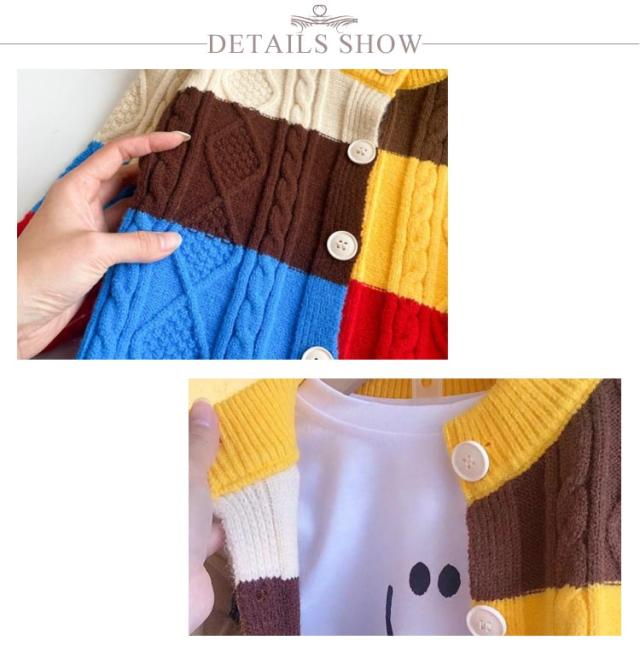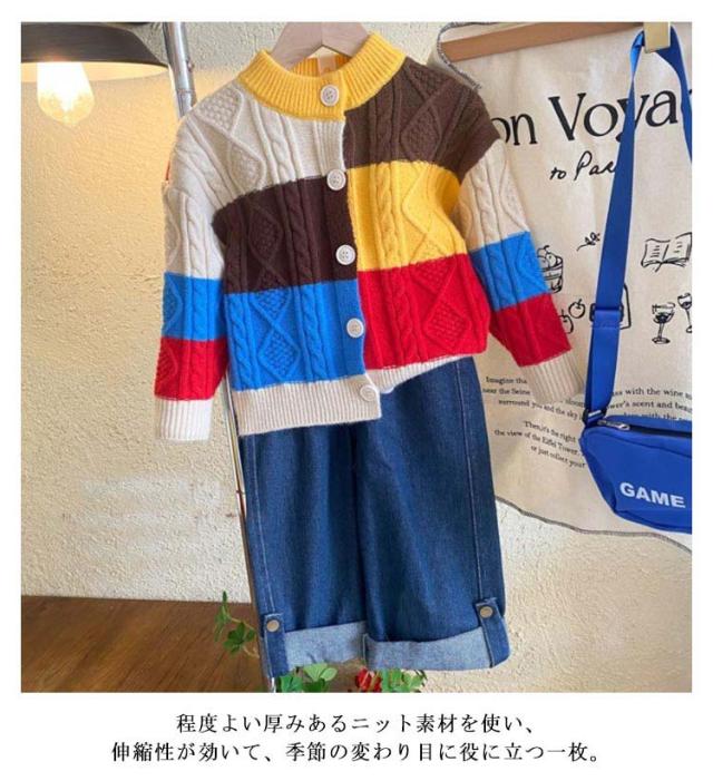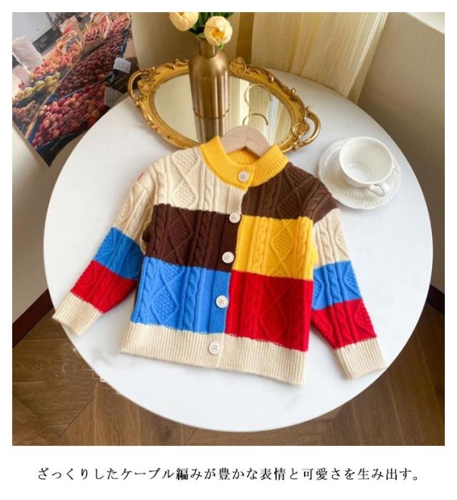 | カラフルの男の子ニットカーディガン。 ざっくりしたケーブル編みが豊かな表情と可愛さを生み出す。 程度よい厚みあるニット素材を使い、伸縮性が効いて、季節の変わり目に役に立つ一枚。 | |
