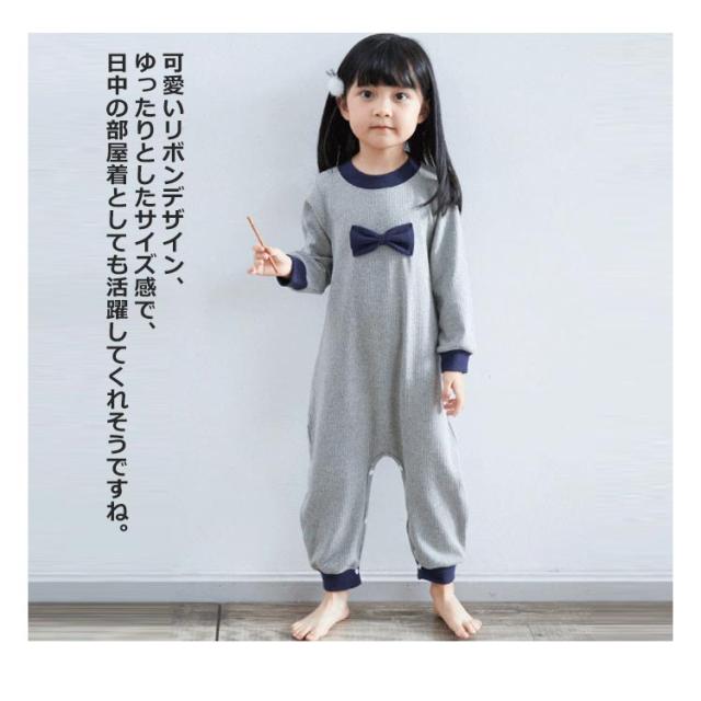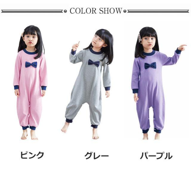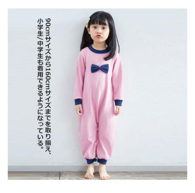 | ジュニアサイズまで展開!寝冷え防止のつなぎパジャマ! 90cmサイズから160cmサイズまでを取り揃え、小学生/中学生も着用できるようになっている。 つなぎタイプなので、寝ている間にお腹が冷えてしまう心配もありません。 肌触り優しい綿95%生地で、通気性・吸汗性も抜群、大切なお子様により快適な快眠を◎ 股下はスナップボタンで全開できるから、トイレやおむつ替えもラクラク! 可愛いリボンデザイン、ゆったりとしたサイズ感で、日中の部屋着としても活躍してくれそうですね。 | |