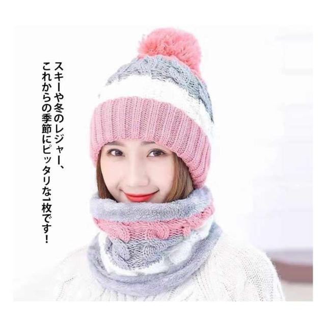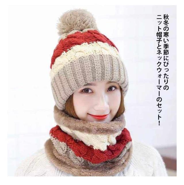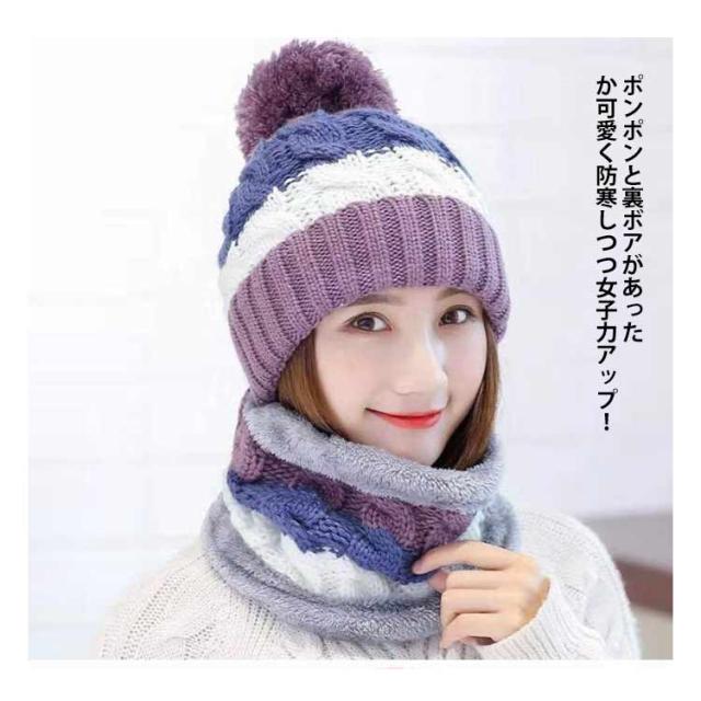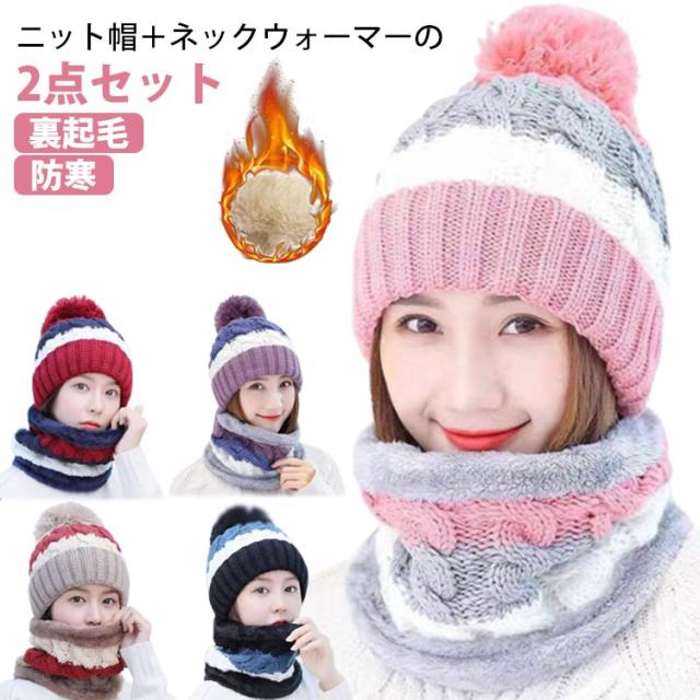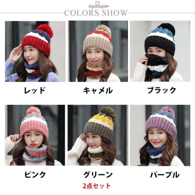 ニット帽+ネックウォーマーの2点セット レディース ニット帽 ネックウォーマー 2点 裏ボア 防寒 キャップ 帽子 ボンボン付き マフラー 裏ボア 裏起毛 アウトドア 秋冬 無地 あったかい 防寒 レッド キャメル ブラック ピンク グリーン パープル 送料無料