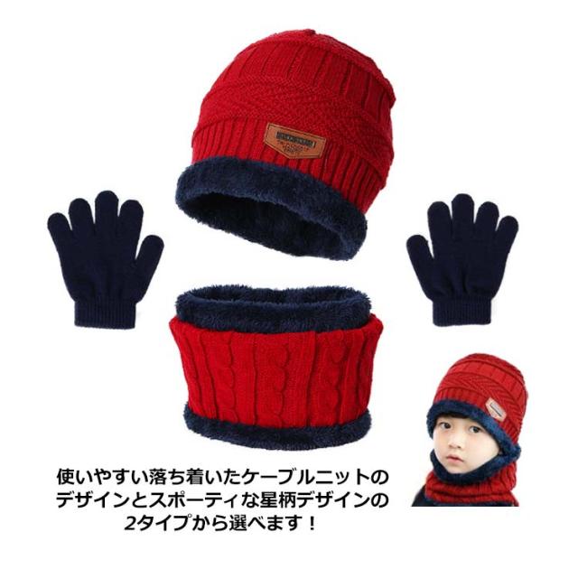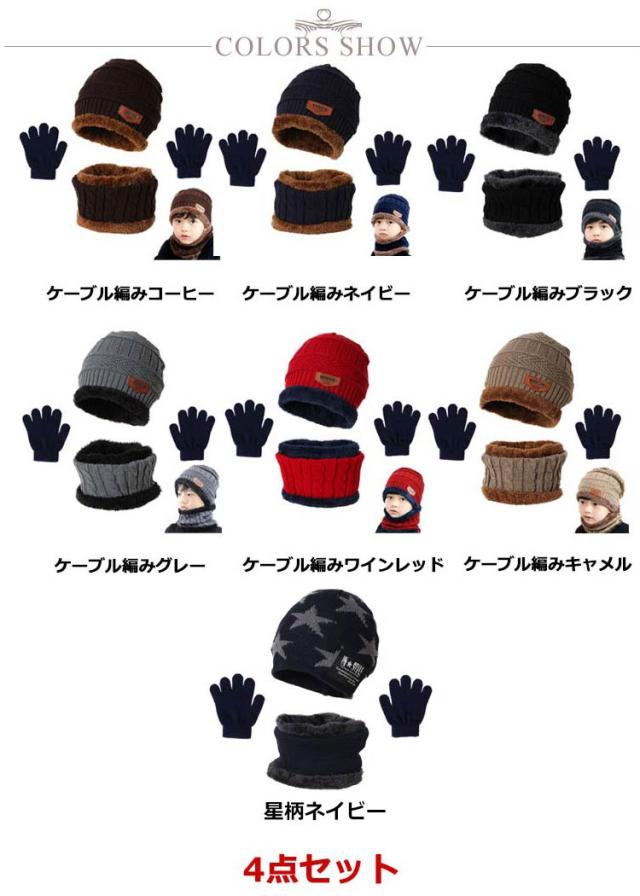 | 4点セット 防寒にぴったりのキッズニット帽&スヌード&手袋セット! スヌードは裏ボアになっているので首元がとても暖かいです。 使いやすい落ち着いたケーブルニットのデザインとスポーティな星柄デザインの2タイプから選べます! | |