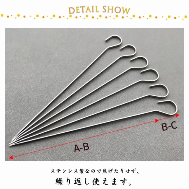 | オーブンにおまかせ♪ バーベキューのような串焼きを自宅で楽しめる焼き串20本セットです。 吊り下げられるフック付です。 ステンレス製なので焦げたりせず、繰り返し使えます。 この焼き串は食材を指す部分を平らに加工することで作業の効率をアップ。 | |