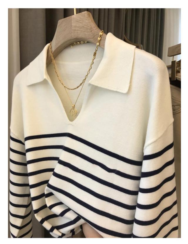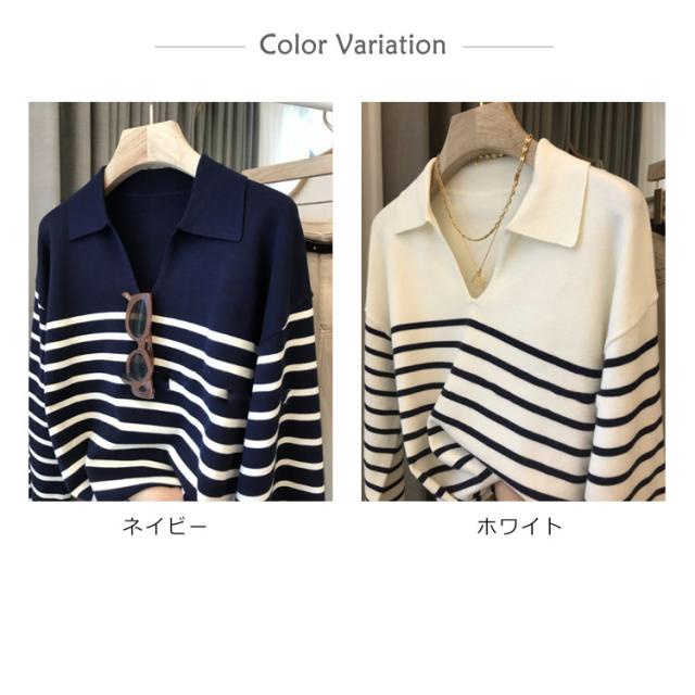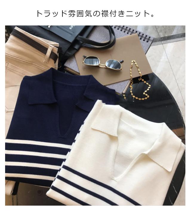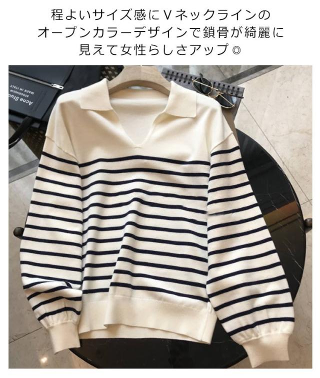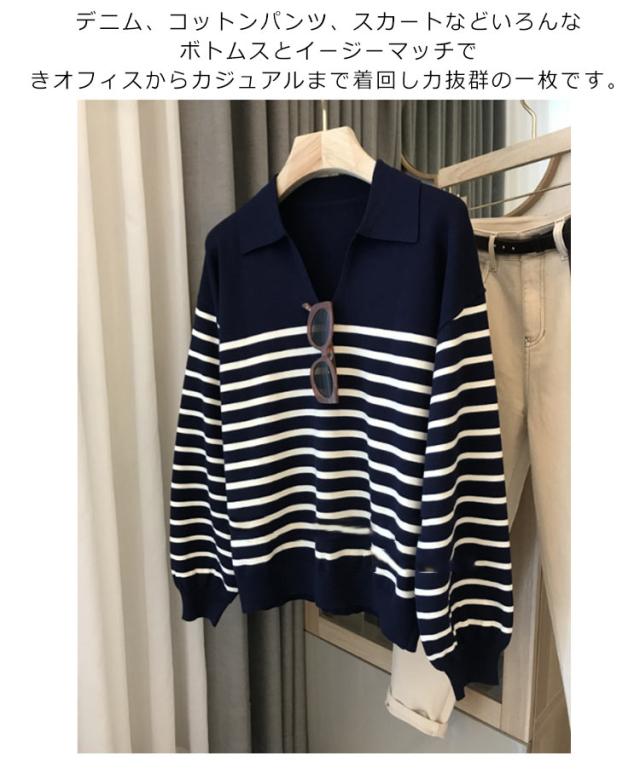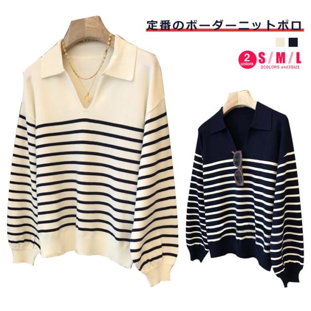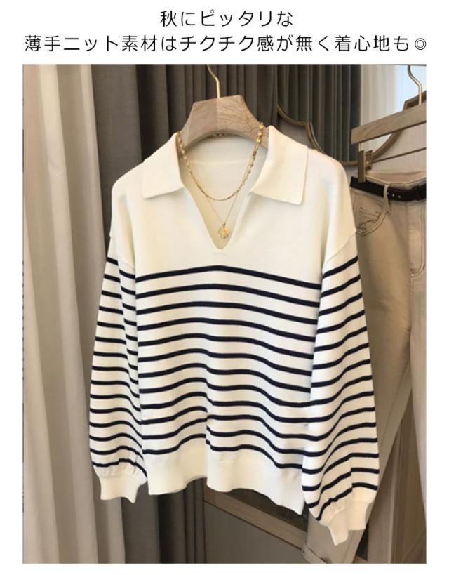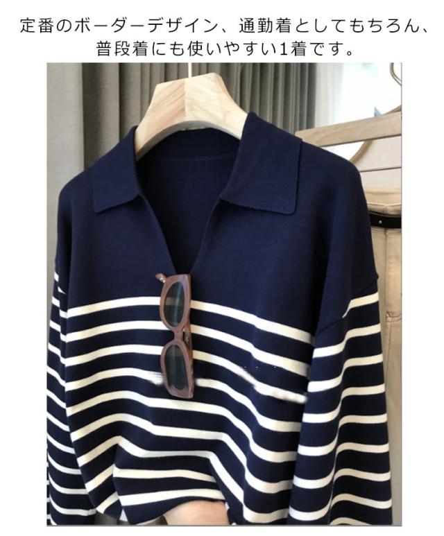 ニット レディース 秋 ニットポロ ボーダー Vネック 長袖 ポロシャツ カットソー 襟 襟付き 襟付きニット ボーダー カジュアル tシャツ 秋冬 春服 フォーマル シンプル 着?せ 体型カバー おしゃれ 大人 女性 ギフト プレゼント 送料無料 通勤 オフィス OL