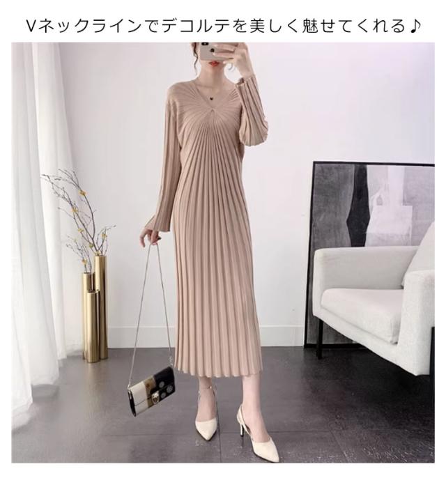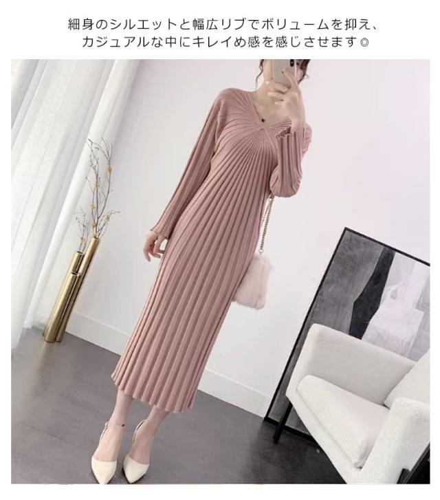 ニットワンピース リブニット レディース ワンピース Vネック ニットワンピ きれいめ 着?せ 秋冬 春 細身 幅広リブ ニットワンピタイト 長袖 ロングワンピース ミモレ丈 重ね着 レイヤード あったか 大人女性 上品 フォーマル 二次会 体型カバー 送料無料 ギフト