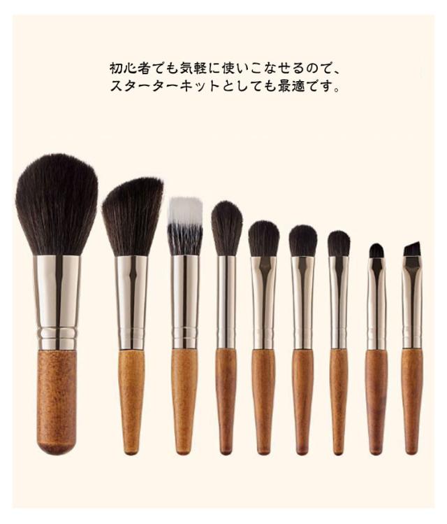 | 出張や旅行でも持ち運びにとても便利!コンパクトメイクブラシセット 毎日のメイクアップに必要な9本が揃った、一般的なメイクブラシより短いサイズ。 形と大きさの違う筆先で顔の構造にきちんと合わせやすく、メイクがより楽しくより簡単に♪ 厳選したナイロン毛を使用、毛質は細かく、しっかりとボリュームもあります。柔らかな肌触りと心地よいメイク体験をすることができます。 速乾性に優れ、パウダーをしっかりキャッチ。 コンパクト9本のトラベルセット。毎日のメイク、収納、持ち運びを簡単に行うことができます。 初心者でも気軽に使いこなせるので、スターターキットとしても最適です。 | |