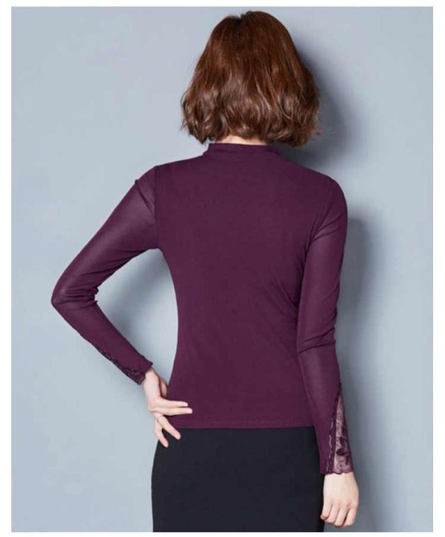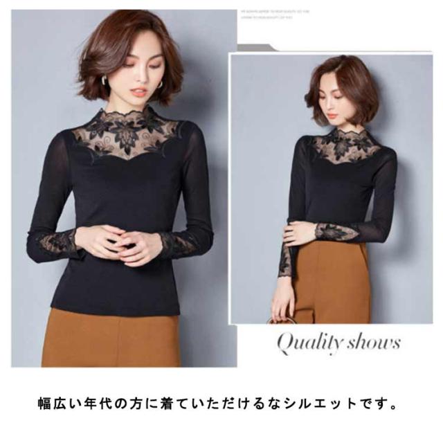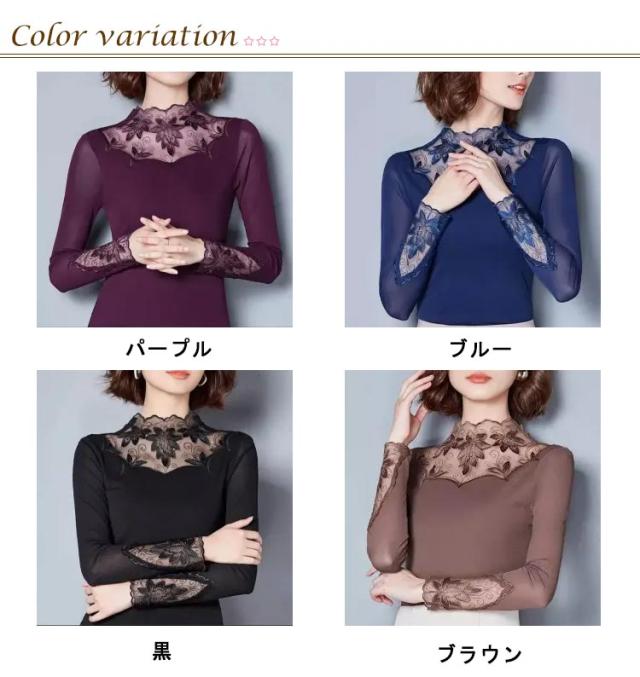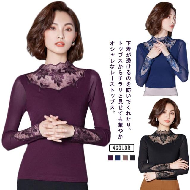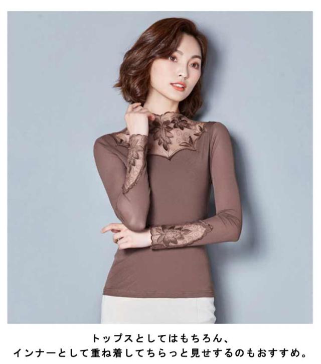 カットソー レース インナー レイヤード レディース 長袖 トップス モックネック ボトルネック 長袖tシャツ ロンT 長袖カットソー レース切り替え 透けない ストレッチ インナートップス コーデ 重ね着 韓国 きれいめ 大人 可愛い 茶色 黒 【送無】