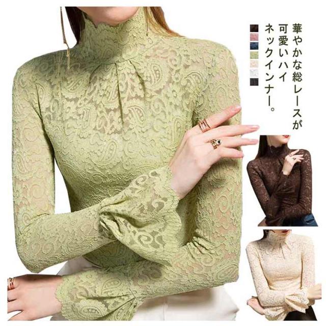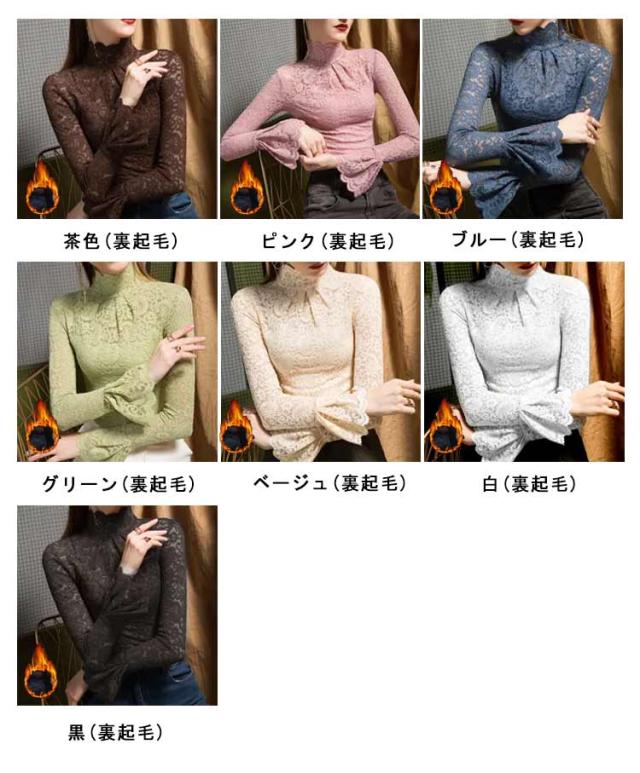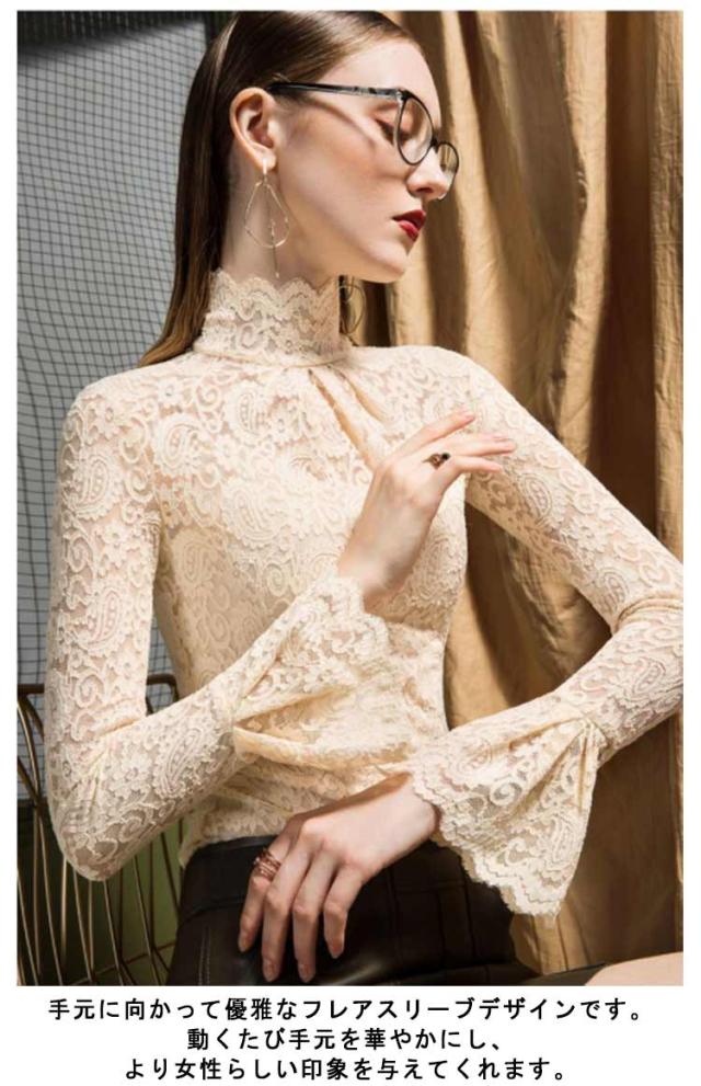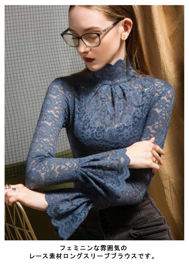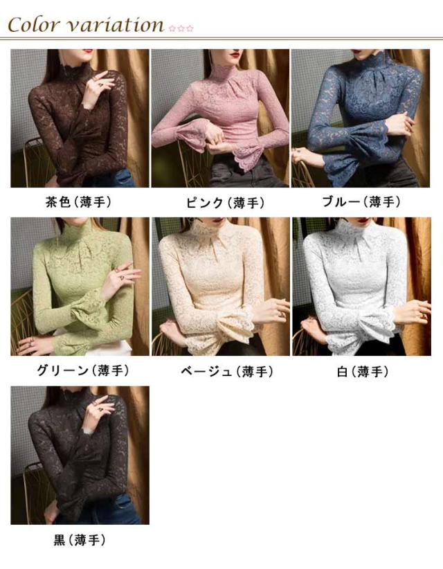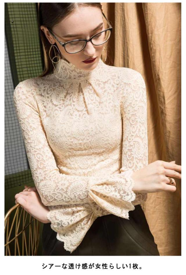 レーストップス 長袖 レディース レース シアートップス モックネック ボトルネック 長袖カットソー 長袖tシャツ ロンT シースルー 透け感 フレア袖 レイヤード インナートップス コーデ 重ね着 韓国 きれいめ 大人 可愛い 裏起毛と薄手2タイプ 【送無】