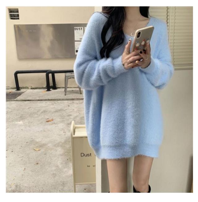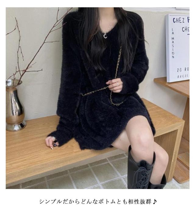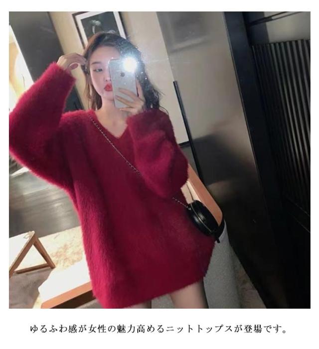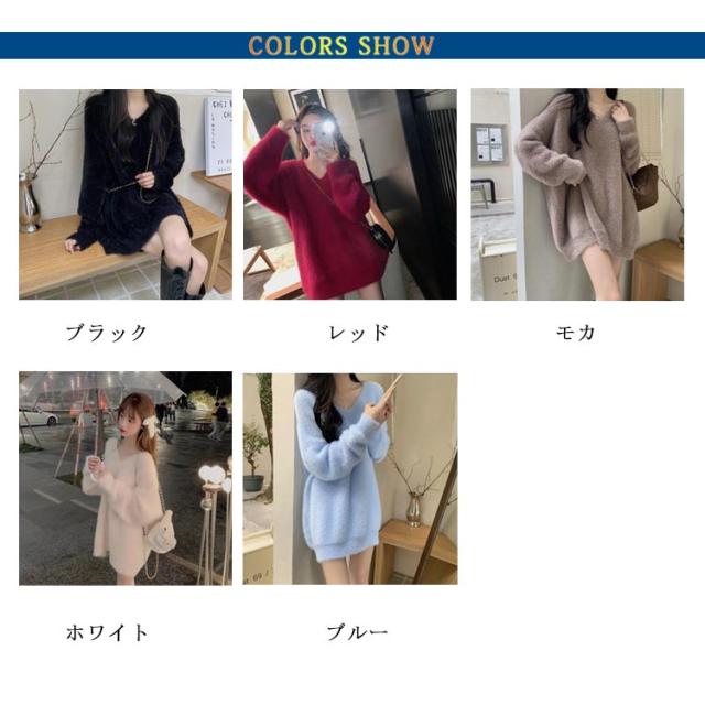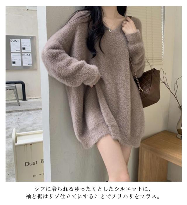 ニット セーター レディース ニットセーター モコモコ トップス Vネック ニット ロング丈 長袖 シャギー シャギー風 起毛 もこもこ ふわふわ ゆったり 体型カバー 柔らかい 無地 カジュアル きれいめ ボリューム袖 ビッグサイズ