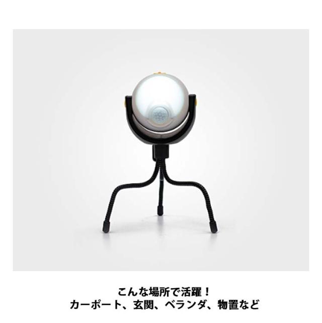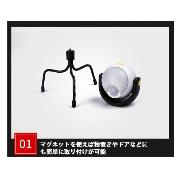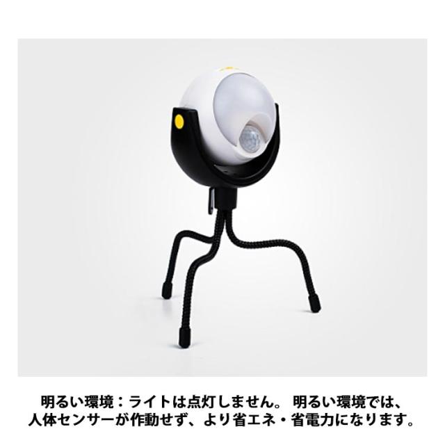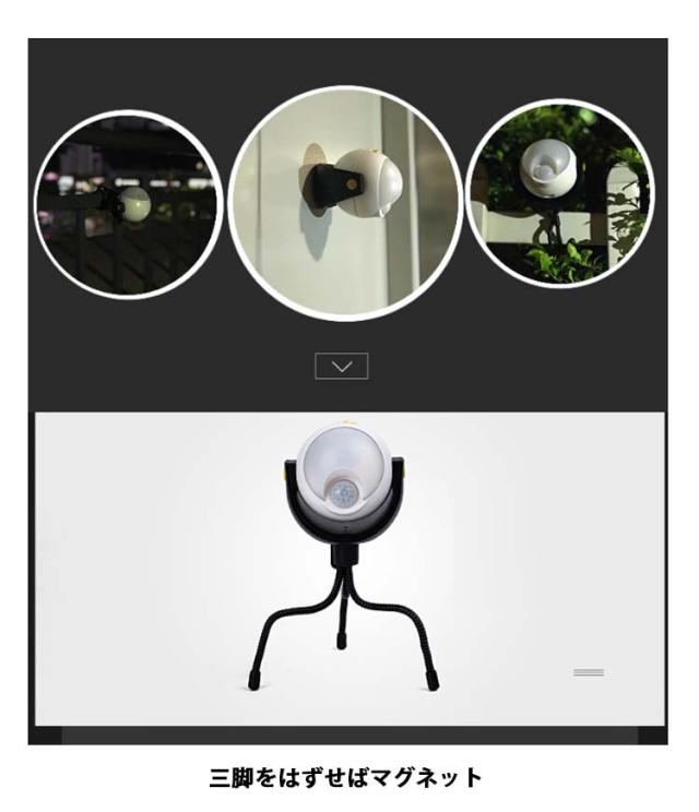 | 乾電池式 人感センサーライト 自動で点灯・消灯 三脚で取付け自由自在! 三脚をはずせばマグネット マグネットを使えば物置きやドアなどにも簡単に取り付けが可能 こんな場所で活躍!カーポート、玄関、ベランダ、物置など 人が来た時だけ点灯し、人がいなくなるとゆっくり消灯する 明るい環境:ライトは点灯しません。 明るい環境では、人体センサーが作動せず、より省エネ・省電力になります。 薄暗い環境:ライトオン。 薄暗い環境では、人を感知すると自動的に点灯し、15秒間人が離れると自動的に消灯します。 | |
