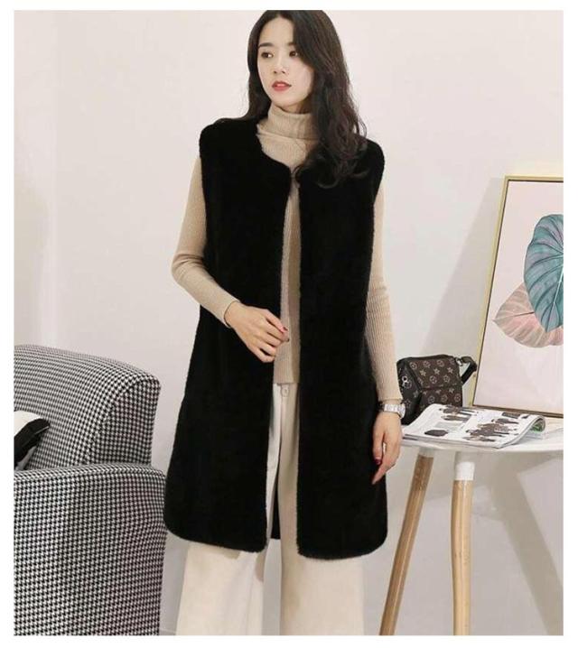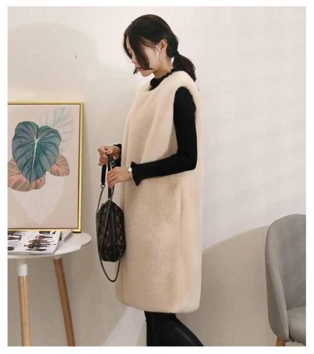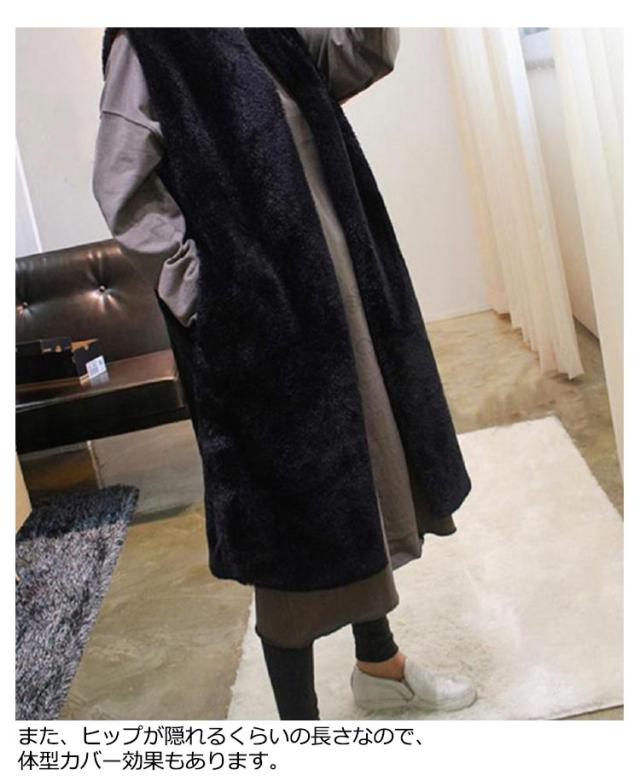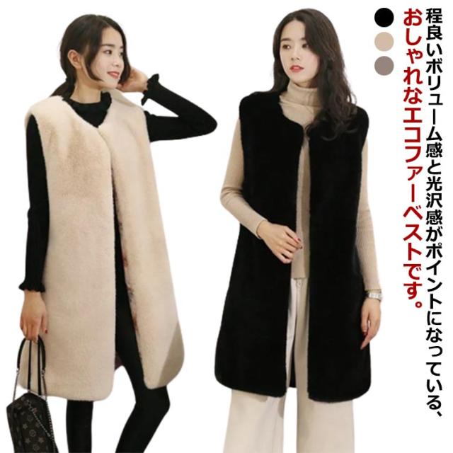 エコ ファー ベスト レディース 春 秋冬 コーデ 前開き ロング丈 ひざ下 モフモフ もこもこ ふわふわ ボリューム ファー ジレ フェイクファー エコファー コード ノースリーブ 袖なし シンプル 大人 カジュアル レイヤード 黒 ブラック グレー ベージュ 送料無料