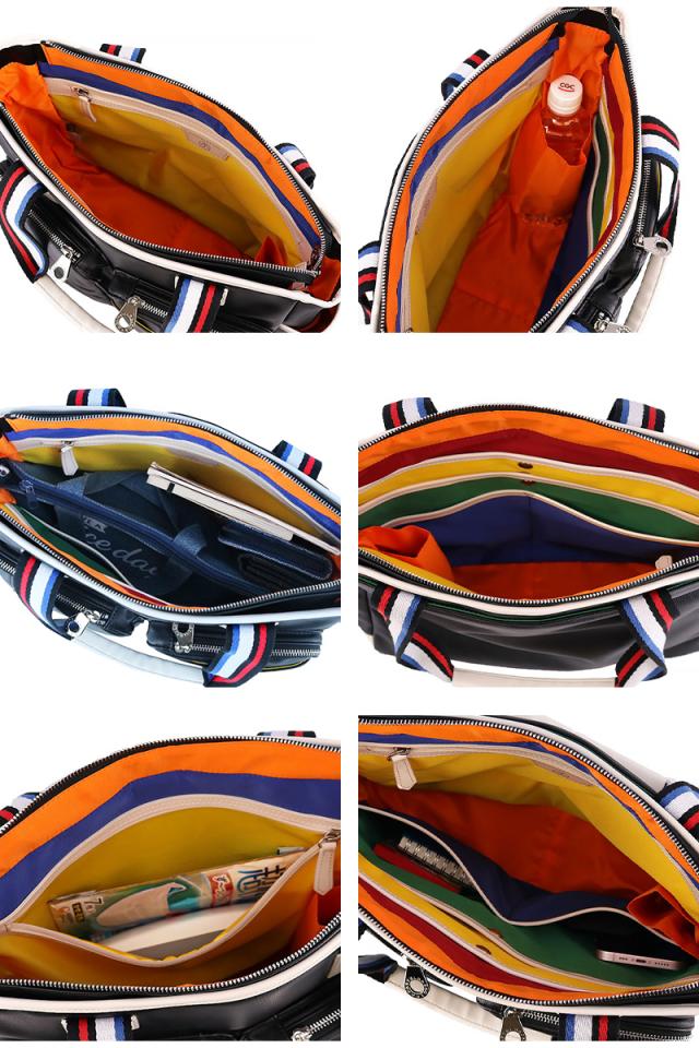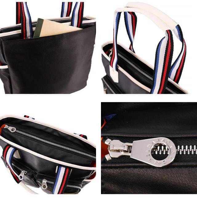 収納機能に特化したデザインになっており、A4ファイルがすっぽりと収まるサイズ感で、更にはペットボトルホルダーがついています。豊富なポケット類に小物を分けて収納できるので、鞄の中身が散らかる心配を解消してくれます。