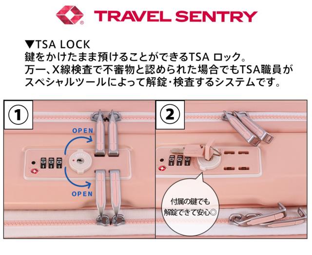 TSAに承認されたロックを使用。ダイヤルロックだけでなく、付属の鍵でも解錠をすることができるデュアルロック仕様です。(※付属の鍵は解錠のみ)