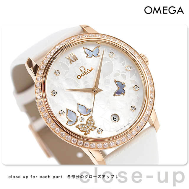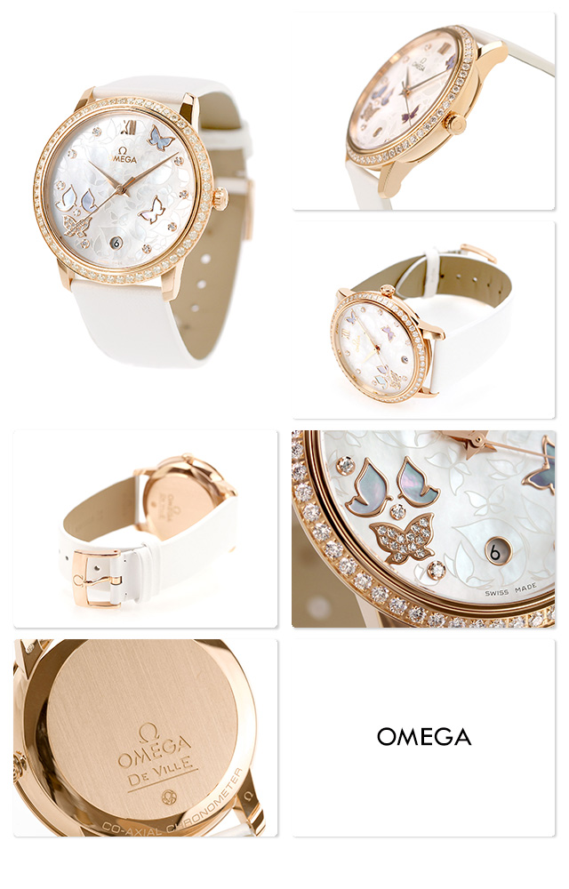 5年保証キャンペーン オメガ デビル プレステージ コーアクシャル クロノメーター バタフライ 36.8mm 蝶 ダイヤモンド スイス製 レディース 腕時計 424.57.37.20.55.003 OMEGA DE VILLE PRESTIGE CO-AXIAL 36.8MM アナログ ホワイト 白 ◆オメガは1848年、ルイ・ブランによってスイスにて設立された高級腕時計ブランドです。 デ・ヴィル(DE VILLE)はフランス語で「都会」という意味をもちます。1960年、デヴィルは「シーマスター デ・ヴィル」として、シーマスターラインの一つとして登場しました。流行を先取りしたスタイルやエレガントなデザインが魅力です。豪華な仕上げとタイムレスなデザインを備えたシンプルなスタイルが特徴。デコラティブなバタフライ(蝶)の装飾を施した魅力的なホワイトマザーオブパールのダイアルには、9個のダイヤモンドインデックスが付属しています。ダイヤモンドがセットされたベゼルが取り付けられた18Kレッドゴールド製ケースには、サテン仕上げのレザーストラップが付属しています。コーアクシャルキャリバー2500搭載。 機械式腕時計