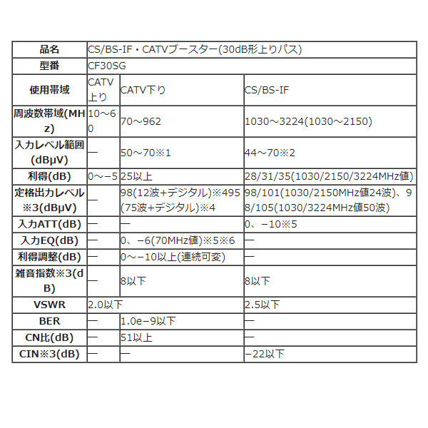 増幅帯域:CATV下り 25dB、BS/CS 28/35dB。