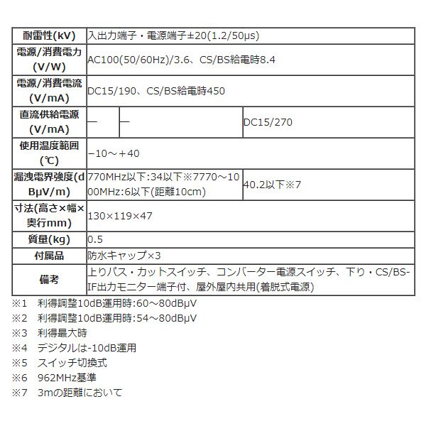 備考:上りパス・カットスイッチ、コンバーター電源スイッチ、下り・CS/BS-IF出力モニター端子付、屋外屋内共用(着脱式電源)
