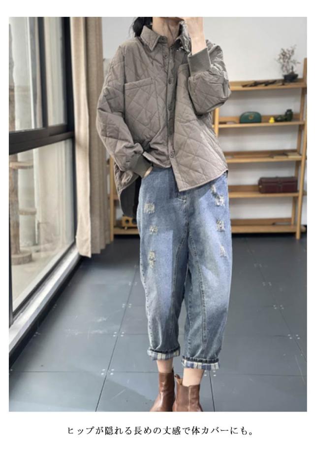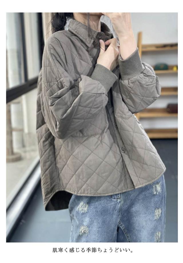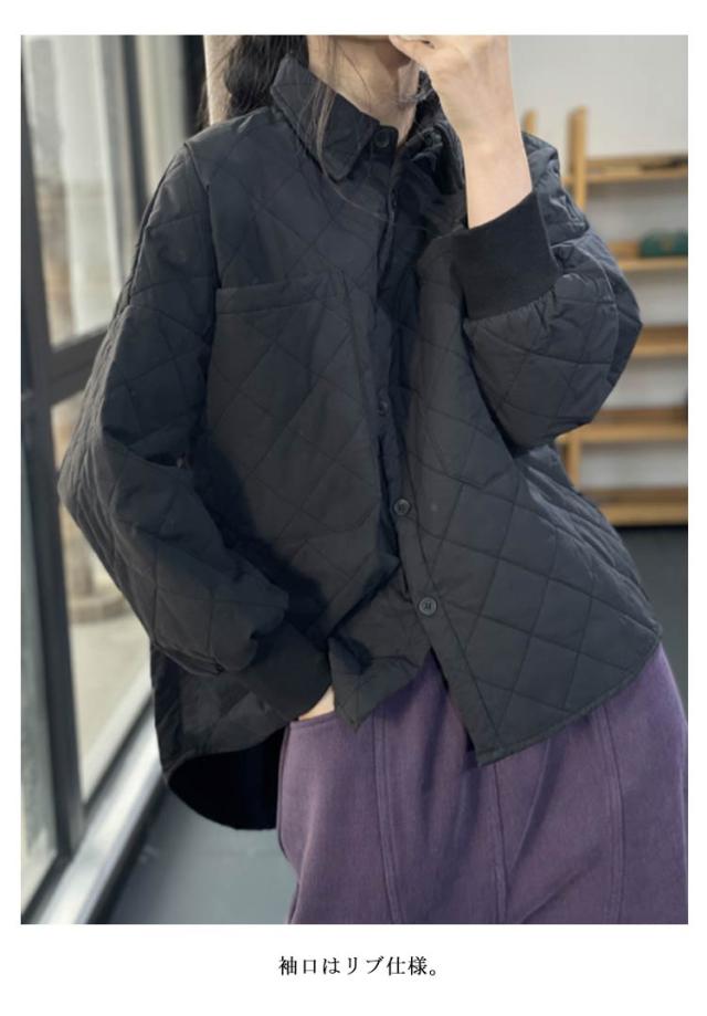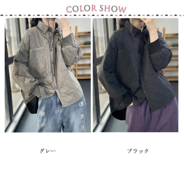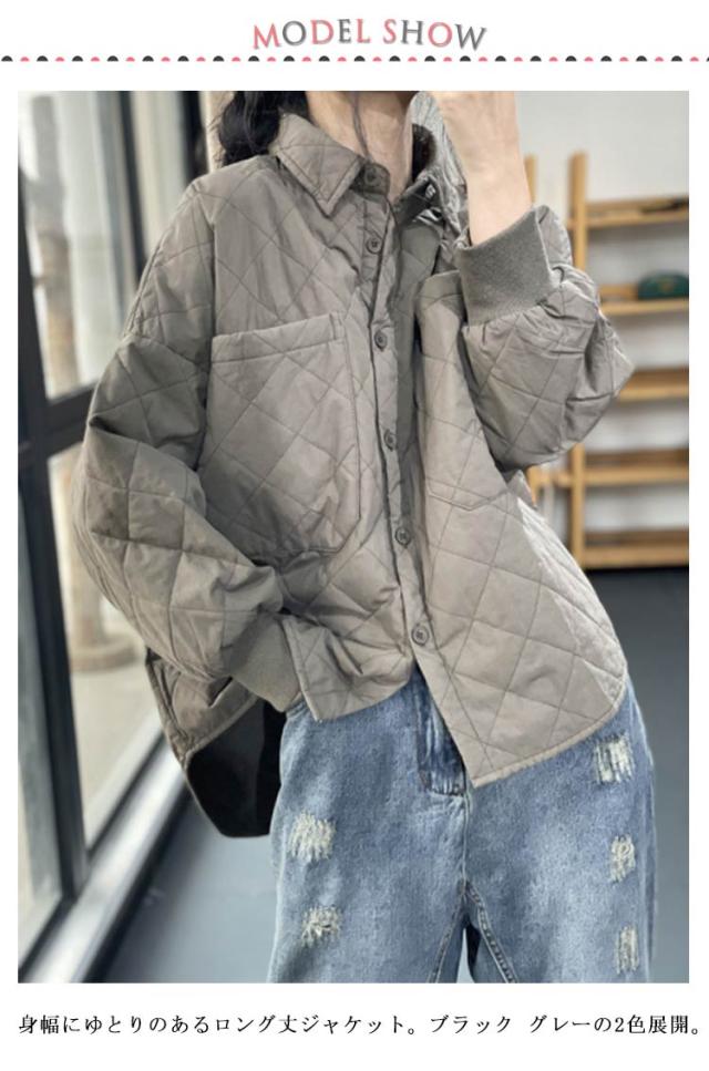 | キルティング素材中綿入りでふんわり。気軽に羽織れるアウター。 身幅にゆとりのあるロング丈ジャケット。ブラック グレーの2色展開。 肌寒く感じる季節ちょうどいい。 ヒップが隠れる長めの丈感で体カバーにも。 胸に大き目ポケット付き。 袖口はリブ仕様。 | |