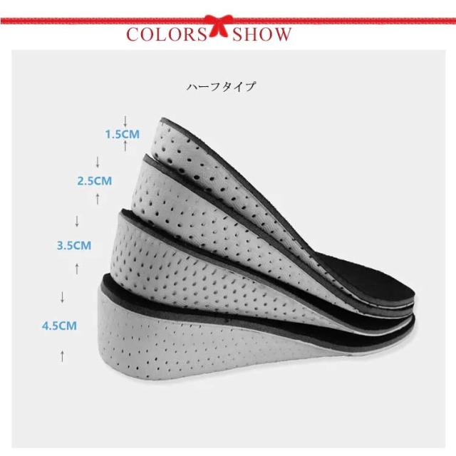 | 1.5cm/2.5cm/3.5cm/4.5cmアップ!男女兼用シークレットインソール 中敷きとしてお手持ちの靴に入れるだけで簡単にヒールアップしてくれます。 外から見てわからないまま、足が長く、姿勢良く、身長アップ &スタイルアップすることができます。 高さは選べる3サイズ:1.5cm/2.5cm/3.5cm/4.5cm 通気性がよく、長時間履いていても蒸れづらく気になる臭いがおさえられます。また、水に強くクッション性があり、衝撃を吸収し、長時間のご使用でも体への負担なく快適に歩いていただけます。 インソール裏のガイド線に沿ってハサミでカットして簡単にサイズ調整できます。 衝撃吸収型のソフトクッションを搭載しておりますので、通勤時や立ち仕事など様々なシーンでお使いいただけます。 選べる2タイプ、ニーズに合わせてお選びいただけるのもうれしい♪ | |