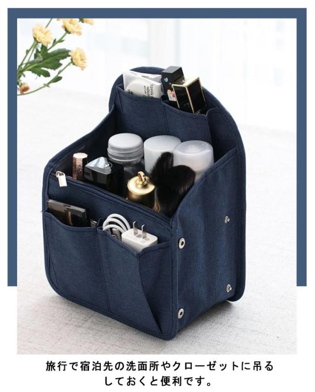 | 便利なリュック用バッグインバッグ。 お財布や手帳や化粧品ポーチやペンやスマホなど収納してリュック内部をスッキリ整頓ができます。 裏面のリングは鍵などをつけておくのに便利! 旅行で宿泊先の洗面所やクローゼットに吊るしておくと便利です。 | |