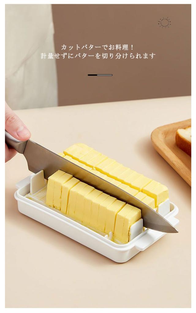 | 計量せずにバター適量を手早く切れる、カッティングガイド付。 カットバターでお料理!計量せずにバターを切り分けられます カット後のバターはケースに入れて保存することが可能。 乾燥を防ぐフタ付バターケース、切ったままケースごと冷蔵庫で保管 カロリーコントロールやパン・お菓子作りにも重宝します。 | |