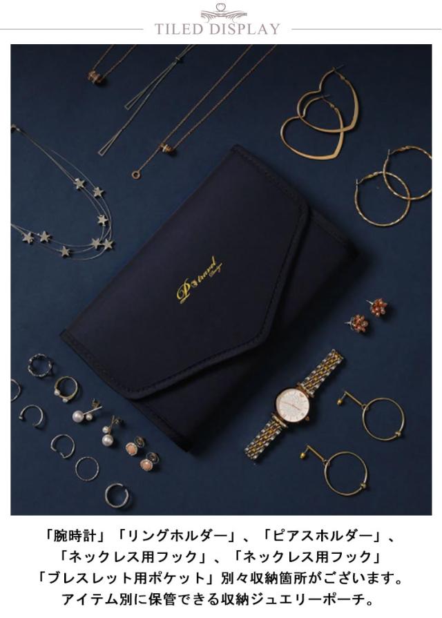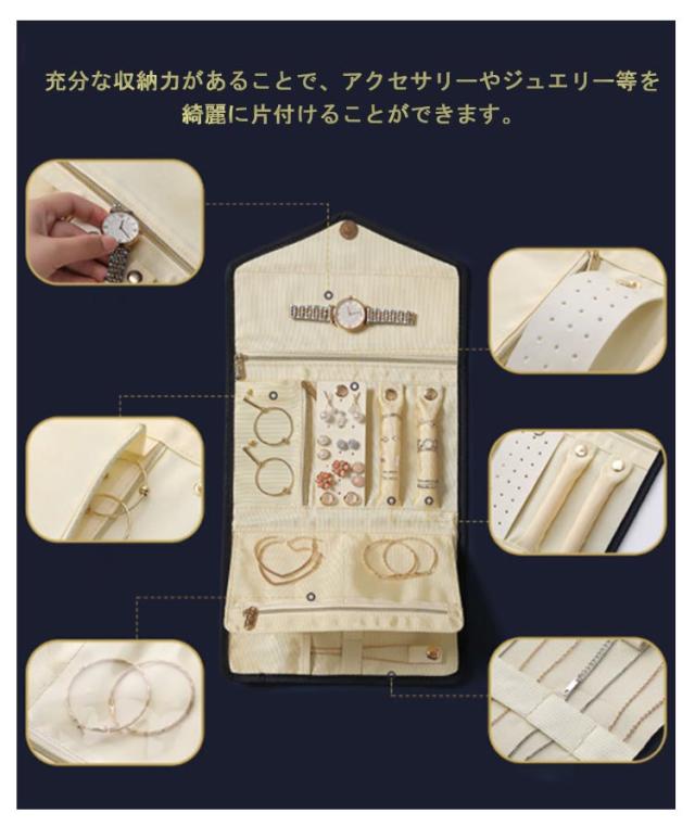 | 「腕時計」「リングホルダー」、「ピアスホルダー」、「ネックレス用フック」、「ネックレス用フック」「ブレスレット用ポケット」別々収納箇所がございます。アイテム別に保管できる収納ジュエリーポーチ。 充分な収納力があることで、アクセサリーやジュエリー等を綺麗に片付けることができます。 柔らかく柔軟性があり、軽量でケースの中に入っている貴重品や小物などのアイテムを傷から守り、バッグに入れる時もカバンの内部の傷や汚れを防ぎます。 お出かけ、出張や旅行など少し多めにジュエリーを持っていきたい方などに最適な商品となっています。 自分へのご褒美、家族・恋人・友達のための誕生日プレゼント、クリスマスギフトや、ホワイトデー、母の日、記念日のプレゼントにも! | |