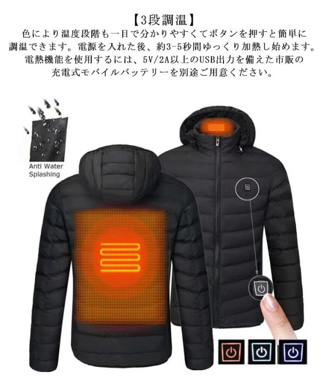 電熱ジャケット 3段温度調整 2つヒーター付き 加熱ジャケット ヒーター 電熱ジャケット 電熱ウェア メンズ レディース 秋冬物 USB加熱 電熱ウェア 中綿コート 作業着 ブルゾン 防寒 バッテリー給電 バイク 発熱ジャケット 洗える アウトドア 敬老の日 ギフト