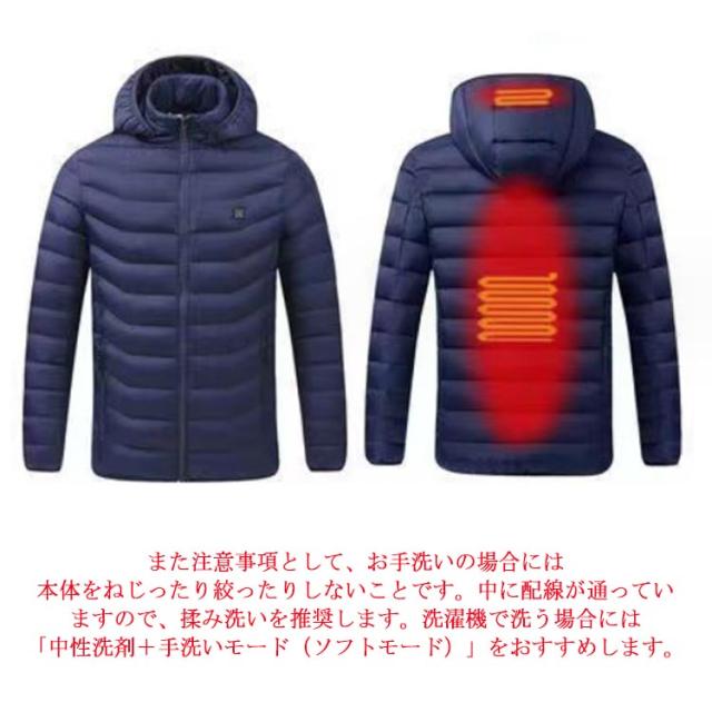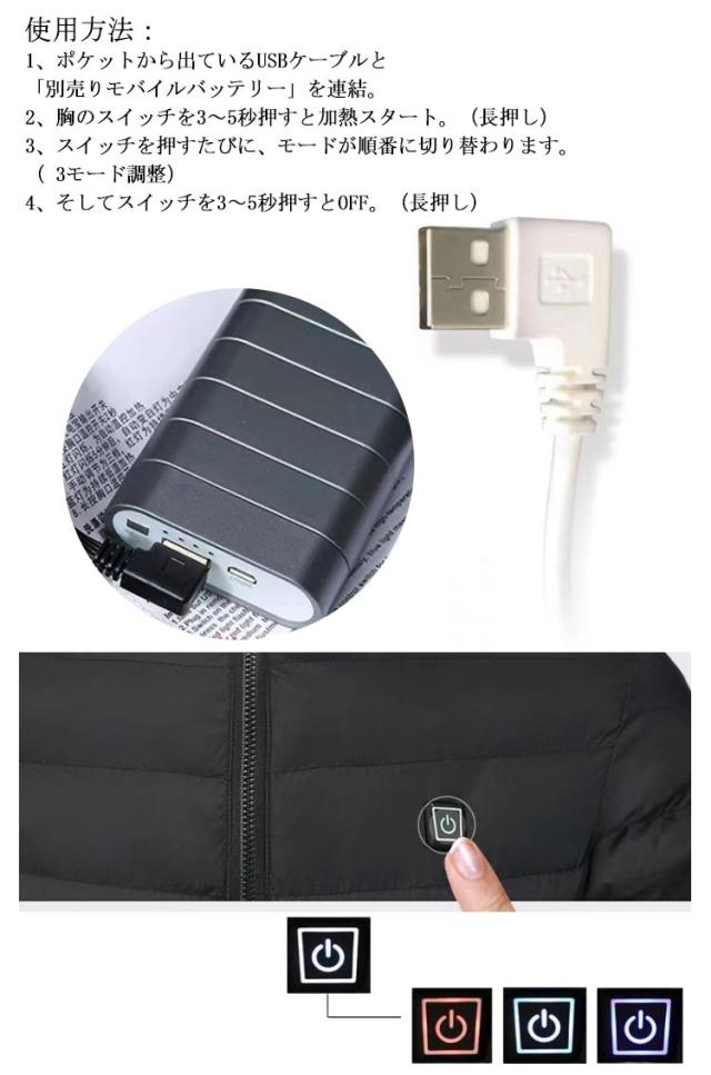 | 【軽量防寒&2つヒーター】軽薄で、手触りが細かくて、柔らかくて、保温が良くて、変形しにくくて、シルクを通すことができないなどの優良な性質を持っています。そして、保温性能は同等の重量の綿毛を上回っています。ベストの中に、首、背中の2箇所にヒーターを内蔵されます。2箇所で同時に温めて、真冬でも体を暖かくして、寒さを恐れず、冬を楽しむことができます。 【3段調温】色により温度段階も一目で分かりやすくてボタンを押すと簡単に調温できます。電源を入れた後、約3-5秒間ゆっくり加熱し始めます。電熱機能を使用するには、5V/2A以上のUSB出力を備えた市販の充電式を別途ご用意ください。 【健康に良いジャケット】 安全、知能に発熱できます。体が冷えると内臓の働きも鈍くなって代謝が落ちます、健康としては良くない話です。この電熱ジャケットは発熱性能で体を温める同時に保温性能も優れて、電熱ジャケットは首と背中を加熱し、体の機能を正常に保ちます。 【幅広い実用性】シンプルでおしゃれなので、男女兼用可能です。S-6XLまで幅広いサイズ展開で、幅広い体型の方に対応します。電熱ジャケットはファスナーデザインして、穿脱便利です。生理期、アウトドアスキー、冬のお釣り、マウンテンバイク、キャンプ、スノートレッキング、アウトドア、ショッピング、オフィス、家庭などに適用できます。実用性が広いので、両親、子供、恋人、友達などにプレゼントするのもいいアイデアです。 使用方法: 1、ポケットから出ているUSBケーブルと「別売り」を連結。 2、胸のスイッチを3〜5秒押すと加熱スタート。(長押し) 3、スイッチを押すたびに、モードが順番に切り替わります。( 3モード調整) 4、そしてスイッチを3〜5秒押すとOFF。(長押し) また注意事項として、お手洗いの場合には本体をねじったり絞ったりしないことです。中に配線が通っていますので、揉み洗いを推奨します。洗濯機で洗う場合には「中性洗剤+手洗いモード(ソフトモード)」をおすすめします。 | |