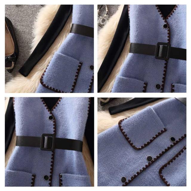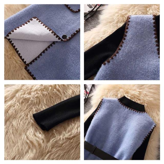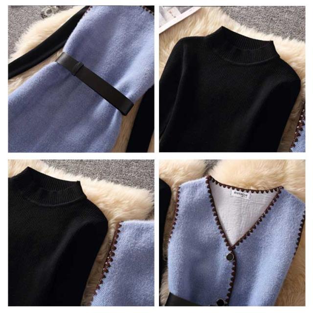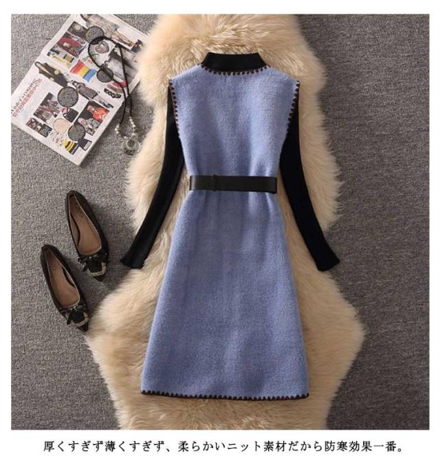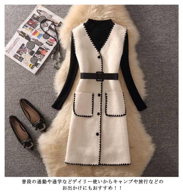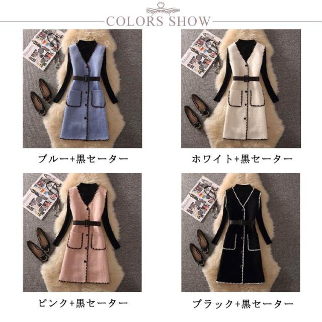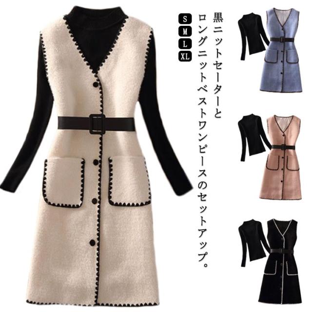 送料無料 セットアップ レディース 長袖ニット&ニットベスト 2点セット ベスト ワンピース ベルト付き セーター ニットワンピース Vネック ポケット付き 通勤 秋 冬 キレイめ 可愛い