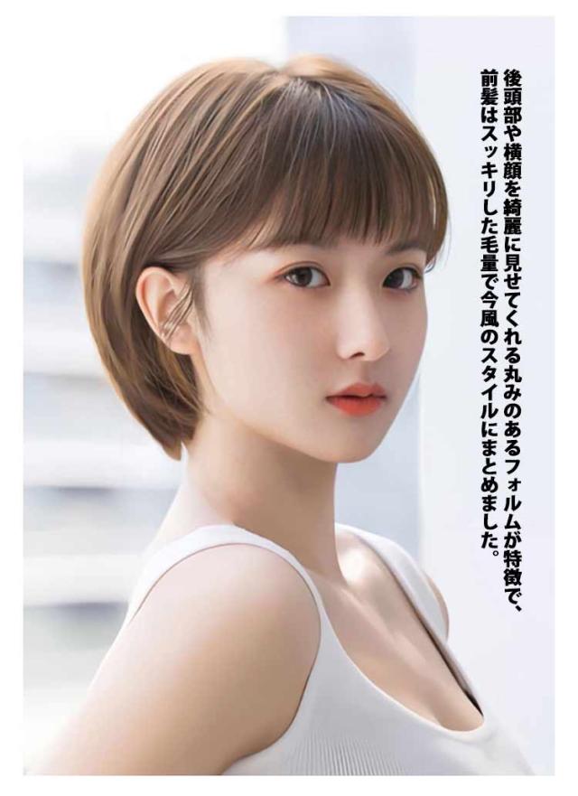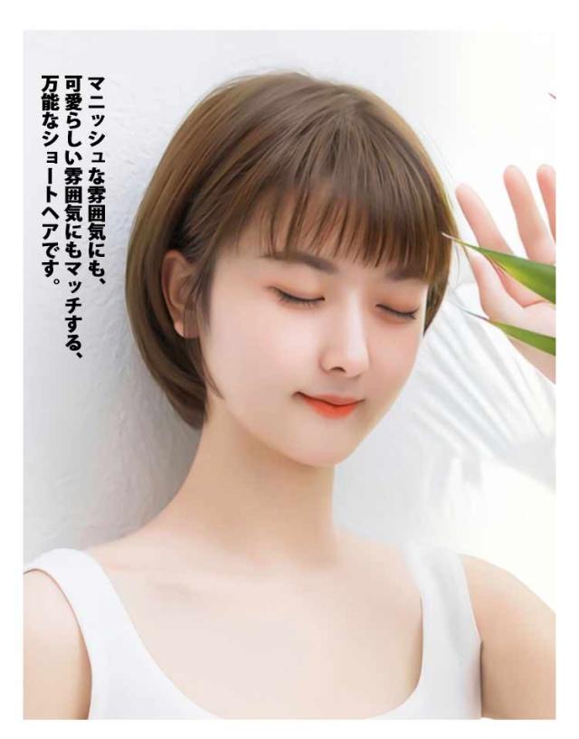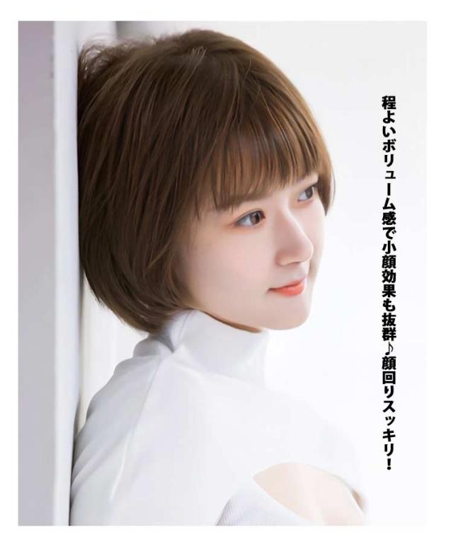 | 【フルウィッグ】【大人可愛い】【小顔効果】 全体はコロンと丸く大人可愛いシルエットのショートヘアは抜け感を与えてくれる。 後頭部や横顔を綺麗に見せてくれる丸みのあるフォルムが特徴で、前髪はスッキリした毛量で今風のスタイルにまとめました。 マニッシュな雰囲気にも、可愛らしい雰囲気にもマッチする、万能なショートヘアです。 程よいボリューム感で小顔効果も抜群♪顔回りスッキリ! | |