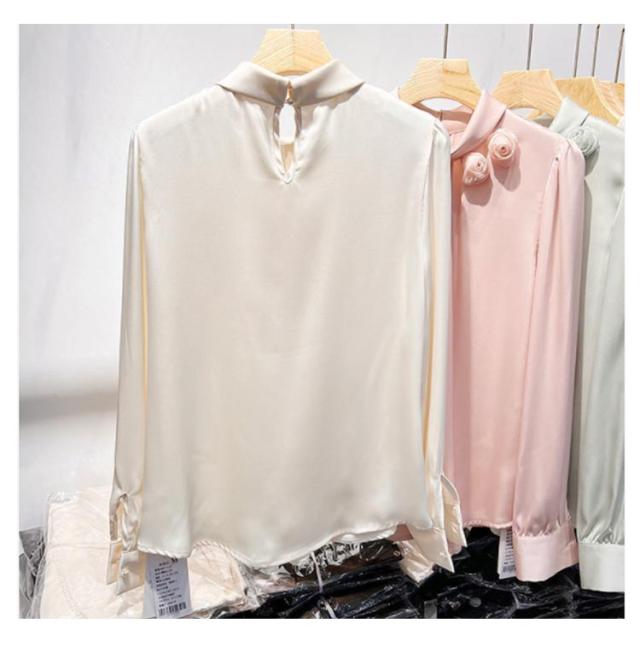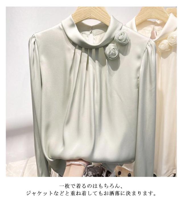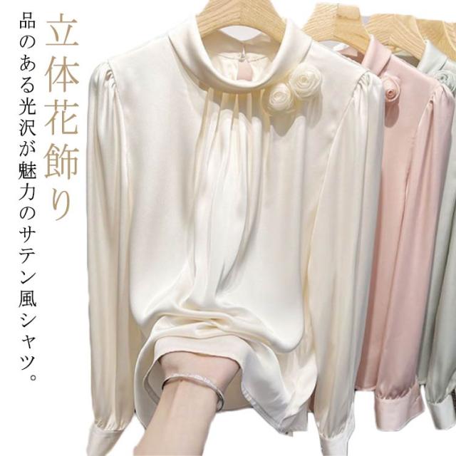 送料無料 サテン調 シャツブラウス レディース 立体フラワー 長袖シャツ ブラウス トップス ゆったり 大きいサイズ 無地 キレイめ 30代 40代 ママ