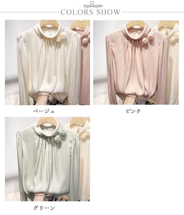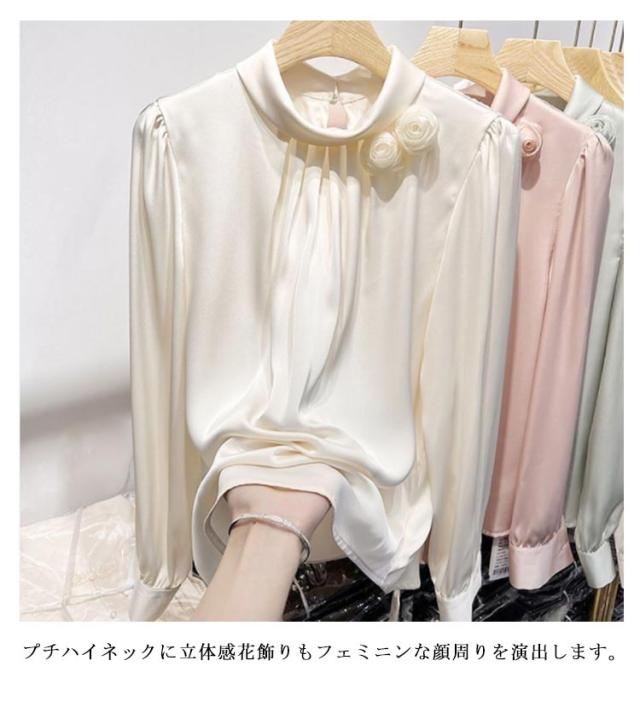 | 品のある光沢が魅力のサテン風シャツ。 プチハイネックに立体感花飾りもフェミニンな顔周りを演出します。 程よくゆとりを持たせた絶妙なシルエットが魅力♪ 一枚で着るのはもちろん、ジャケットなどと重ね着してもお洒落に決まります。 普段使いはもちろん、オフィスシーンにも活躍してくれそう♪ | |
