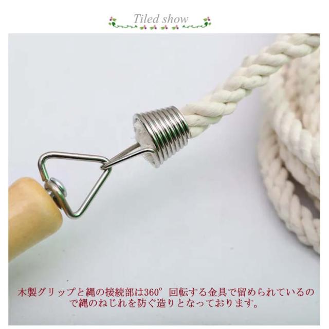 | 体育や運動会、学級活動、イベントなどで大人数で楽しめる大縄跳び用ロープです。 3M/5M/7M/10M/12Mの5種類のバリエーションをご用意しております。 グリップは木製なので手になじみやすく、痛くなりにくい設計となっています。 木製グリップと縄の接続部は360°回転する金具で留められているので縄のねじれを防ぐ造りとなっております。 | |